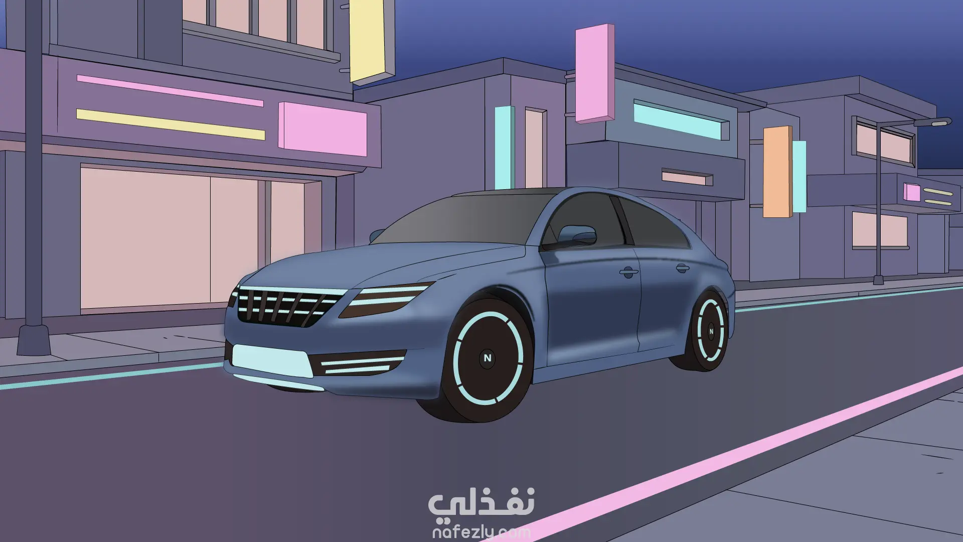 كادر رسومي من مشروع أنيميشن فعلي، يظهر عربة كهربائية في شارع حضري. تم رسم الكادر رقميًا ضمن مشروع كامل تم تحريك بعض مشاهده، لكن هذا الجزء يعرض هنا كرسمة ثابتة فقط، مع الحفاظ على التفاصيل والدقة في الخلفية والعربة.