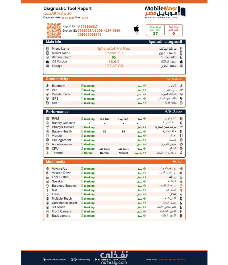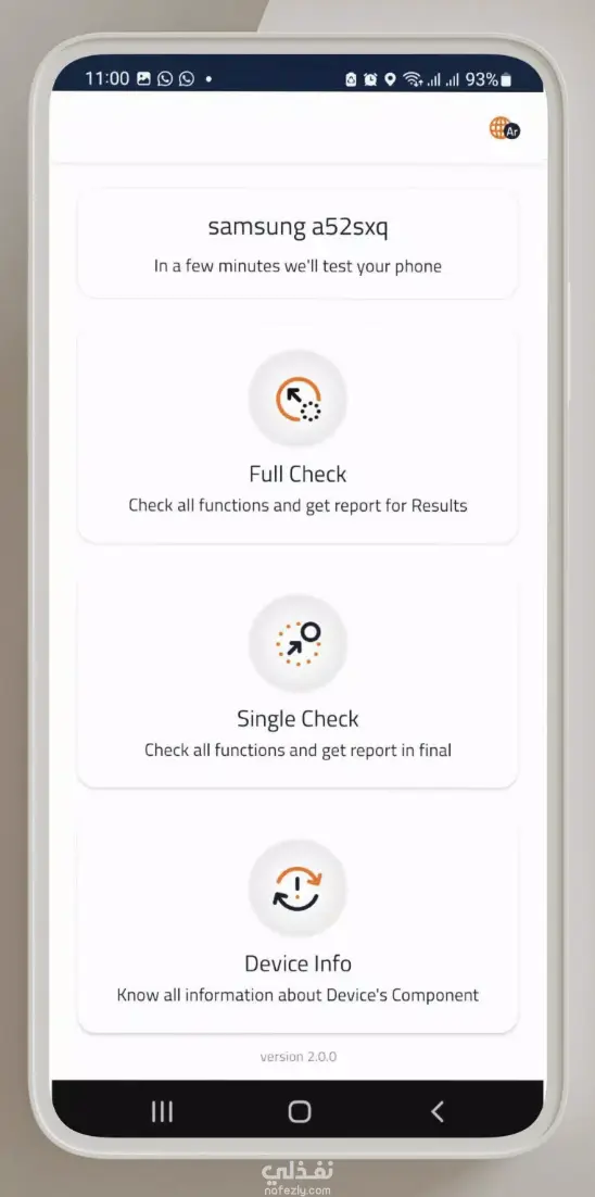 تنفيذ اختبار الأجهزة والمكونات الحسية: البلوتوث، WiFi، GPS، البطارية، الشحن، الكاميرا، اللمس المتعدد… وما إلى ذلك.