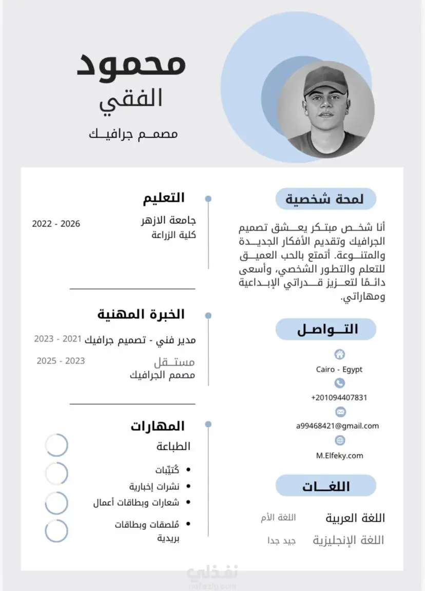 مصمم جرافيك إبداعي وموجه نحو النتائج، بخبرة 5 سنوات في تطوير وتنفيذ حلول بصرية متكاملة تلبي أهداف التسويق وتحقق التفاعل المطلوب . أتمتع بخلفية قوية في تحويل المفاهيم المعقدة إلى تصميمات جذابة ومبتكرة، مع إتقان متقدم لمجموعة برامج Adobe. أسعى للانضمام إلى فريق عمل في شركة ما للمساهمة في تعزيز حضورها البصري وقيمتها السوقية.