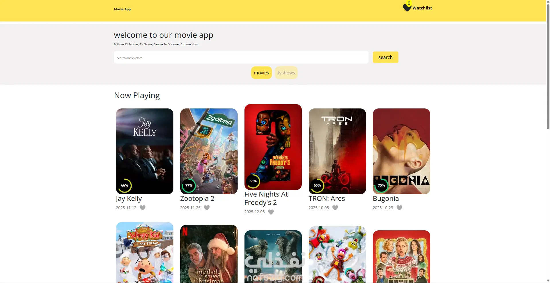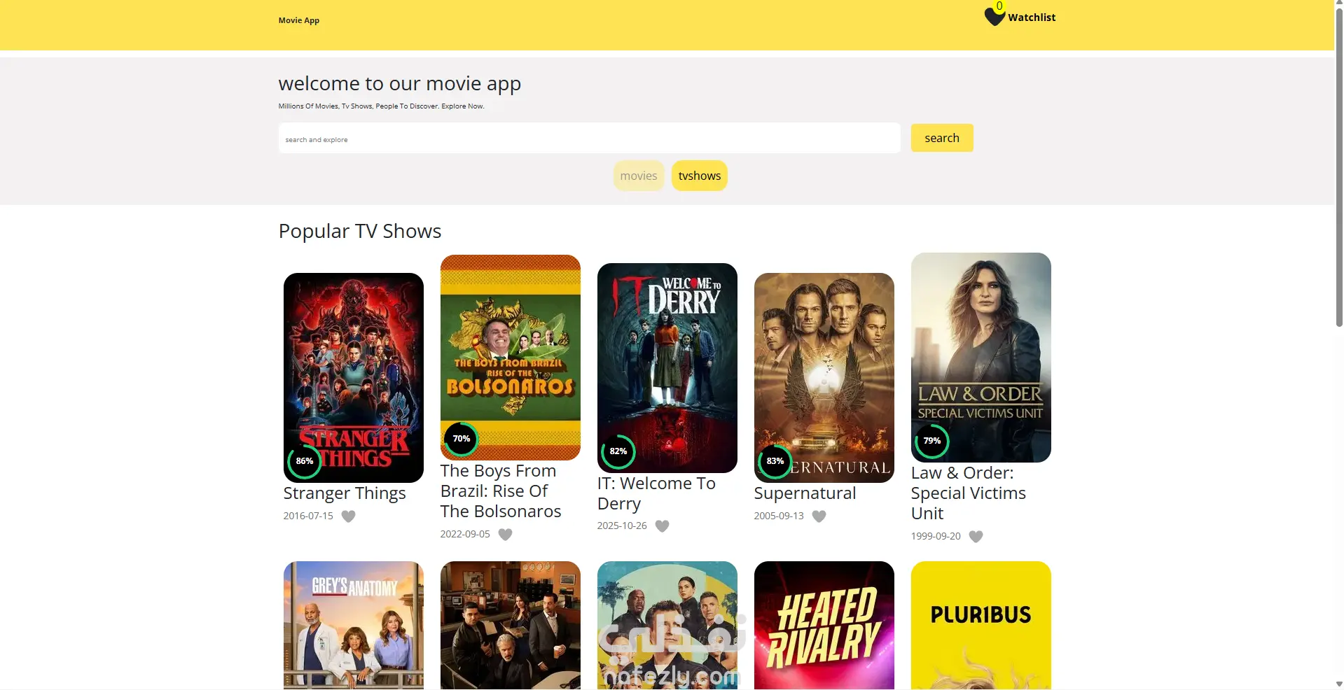 This website is a Movie App built using React, JavaScript, and custom CSS. It allows users to browse, search, and explore movies through a clean and responsive interface. The app uses React’s component-based structure to display movie lists, details, and interactive features efficiently. JavaScript handles the app logic—such as fetching movie data, managing state, and updating the UI—while CSS is used to design a modern and user-friendly layout. Key features include: • Movie listing with posters and descriptions • Search functionality to quickly find titles • Responsive design for mobile and desktop • Smooth navigation and clean UI components Overall, the app delivers a simple, fast, and enjoyable movie-browsing experience, showcasing frontend development skills using modern web technologies.