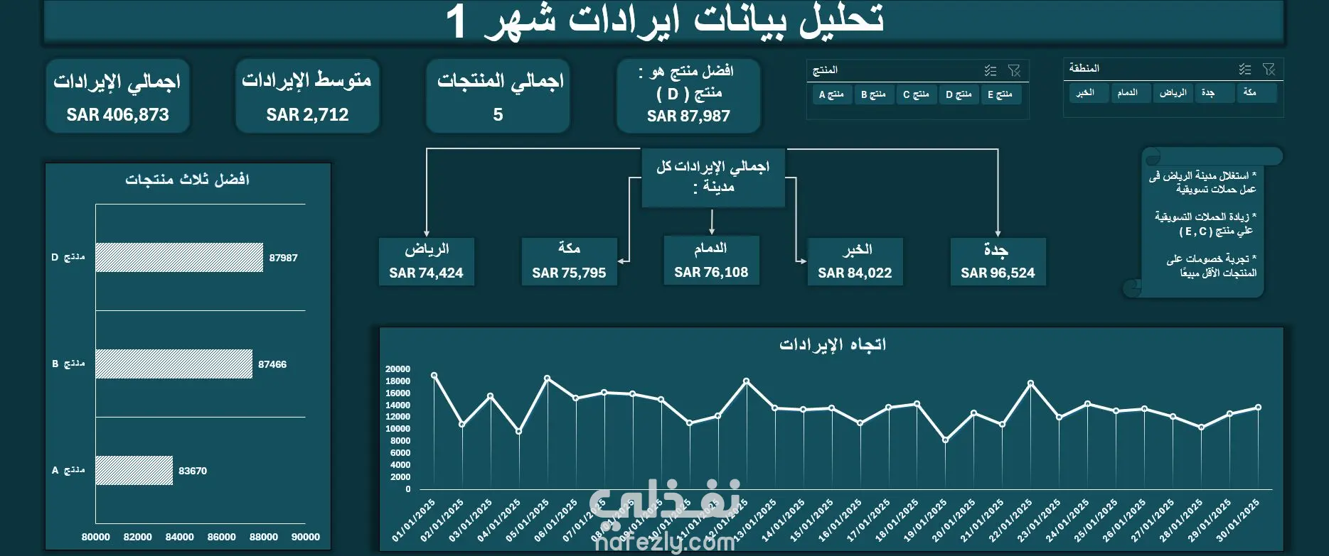 🔧 الخطوات اللي اتعملت: Power Query تعديل الـ Format لكل عمود (تاريخ – أرقام – نصوص). إزالة القيم المكررة (Duplicates). معالجة الأعمدة الفارغة. إنشاء عمود جديد لحساب إجمالي المبيعات (الكمية × السعر). Power Pivot إنشاء علاقات بين الجداول. كتابة معادلات (DAX) لحساب مؤشرات رئيسية زي إجمالي الإيرادات ومتوسط المبيعات. Pivot Tables تلخيص البيانات حسب (المنتجات – المدن – الأشهر). استخراج أعلى 3 منتجات مبيعًا وأعلى مدينة وأقل مدينة. Visualization / Dashboard تصميم لوحة تفاعلية بتوضح اتجاهات المبيعات عبر الأشهر. إبراز أفضل وأسوأ أداء للمنتجات والمدن. 💡 أهم التوصيات: زيادة الترويج لمدينة الرياض (الأقل مبيعًا). رفع مبيعات المنتجات الأقل أداءً (C وE) بعروض خاصة. الحفاظ على زخم المنتجات القوية (D وB) ببرامج ولاء وخصومات موسمية. 📊 التجربة دي وضحتلي قد إيه إن رحلة تحليل البيانات مش مجرد Visualization، لكن عملية متكاملة تبدأ من تنظيف البيانات لحد الوصول لرؤية تساعد في اتخاذ القرار.