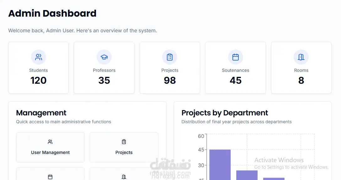 وهو تطبيق ويب موجه لإدارة جلسات الدفاع عن المشاريع النهائية في مؤسسة أكاديمية. النظام مصمم لتسهيل عملية التنظيم والإدارة للمسؤولين من خلال توفير واجهة سهلة الاستخدام لجدولة الجلسات، إدارة الغرف، وضبط الإعدادات الشخصية.