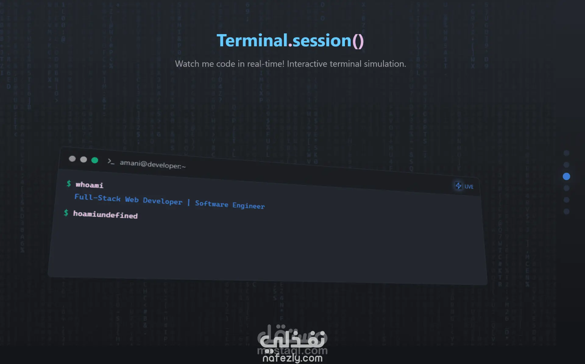 عملت على تطوير ملف أعمال شخصي (Portfolio) حديث يعرض مشاريعي وخبراتي في مجال تطوير الويب. ركزت فيه على إبراز الهوية البصرية والاحترافية التقنية باستخدام أحدث الأدوات في الواجهة الأمامية والخلفية.