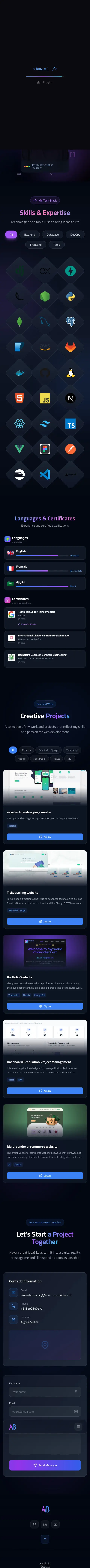 موقع بورتفوليو احترافي متعدد اللغات (عربي، إنجليزي، فرنسي) لعرض مهاراتي ومشاريعي كمطورة Full-Stack. يتميز الموقع بتصميم عصري وتجربة مستخدم سلسة، مع لوحة تحكم كاملة لإدارة المحتوى. تم بناؤه باستخدام React و TypeScript في الواجهة الأمامية، وFastAPI مع PostgreSQL في الخلفية، مع نظام مصادقة آمن باستخدام JWT.
