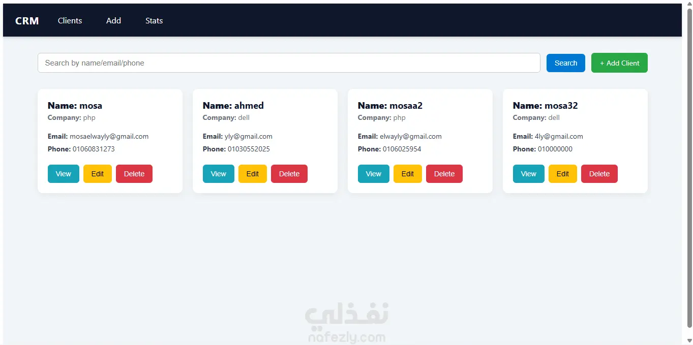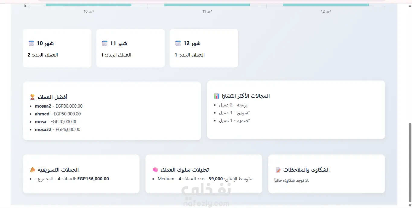 مميزات الخدمة لو عندك شركة وعايز تنظم بيانات عملائك بسهولة: النظام يخزن كل معلومات العملاء (الاسم، الإيميل، الشركة، الهاتف، المعاملات) بطريقة مرتبة وسهلة الوصول. لو حابب تعرف حركة العملاء وتحليل بياناتهم شهريًا: النظام بيقدم تقارير ورسوم بيانية تفاعلية تساعدك تفهم أداء كل عميل ومعاملاته. لو فريقك محتاج تجربة سلسة وسريعة: واجهة النظام سهلة لأي موظف مبيعات أو دعم فني، وبتوفر بحث لحظي وفلترة ذكية لتوفير الوقت. لو عايز تتحكم في صلاحيات الموظفين أو تضيف تقارير جديدة: النظام مبني بطريقة قابلة للتوسع، تقدر تضيف مميزات أو ربطه بأنظمة خارجية حسب احتياجاتك. لو عايز تدعم اتخاذ القرار بإحصاءات دقيقة: التحليلات الشهرية تساعد الإدارة على اتخاذ قرارات مبنية على بيانات حقيقية بدل التخمين