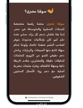 من قلب مصر نصنع تجربة تسوق تُلهمك خدمة موثوقة لكل بيت مصري سوقنا مصري منصة رقمية مخصصة للمحلات الصغيرة والمتوسطة في مصر. إحنا هنا علشان ندعم كل براند محلي عنده حلم كبير لكن بإمكانيات محدودة. بنوفر لصاحب المتجر صفحة خاصة، ولوحة تحكم سهلة تتابع منها المبيعات والزيارات، وكمان دعم حقيقي للنمو من الترويج للمنتجات لتحليلات دقيقة. وللمشترين، بنقدم طريقة ذكية وسهلة لاكتشاف وشراء منتجات مصرية أصلية مع دعم رواد الأعمال المحليين الشغوفين.