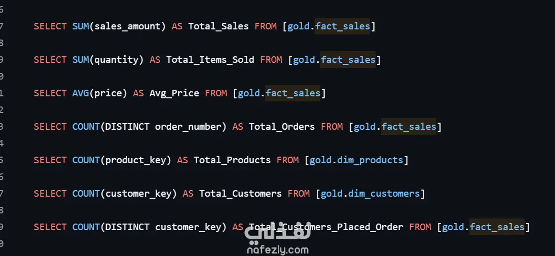 SQL EDA Project – Summary 1. Database Exploration: فحص كل الجداول والأعمدة داخل الـ Gold Schema لفهم هيكل الداتا. 2. Dimensions Exploration: تحديد القيم المميزة للـ countries, categories, subcategories, products لفهم طريقة تقسيم البيانات. 3. Data Exploration: تحليل نطاق الزمن (أول وأخر order). تحليل أعمار العملاء وتحديد الـ data span. 4. Measures Exploration: حساب أهم الـ KPIs: Total Sales – Total Items Sold – Avg Price – Total Orders – Total Products – Total Customers – Active Customers. تجميعها في تقرير واحد. 5. Magnitude Analysis: تحليل الأحجام حسب: الدول – الجنس – الفئة – التكلفة – الإيرادات – العملاء – توزيع المبيعات جغرافيًا. 6. Ranking Analysis: تحديد أعلى 5 منتجات من حيث الإيرادات، وأسوأ 5 منتجات باستخدام Window Functions.