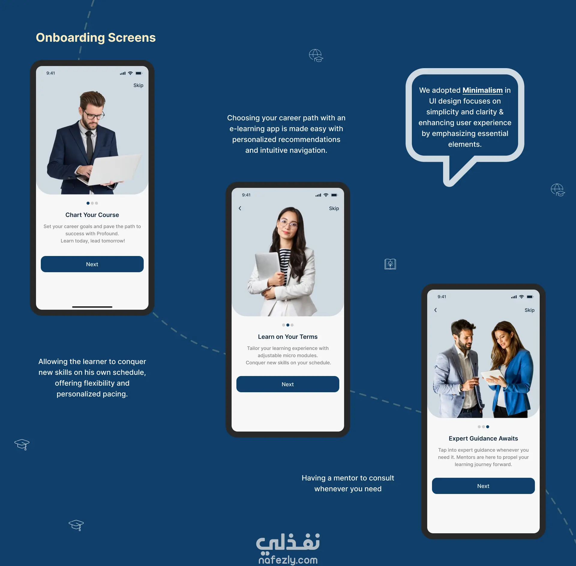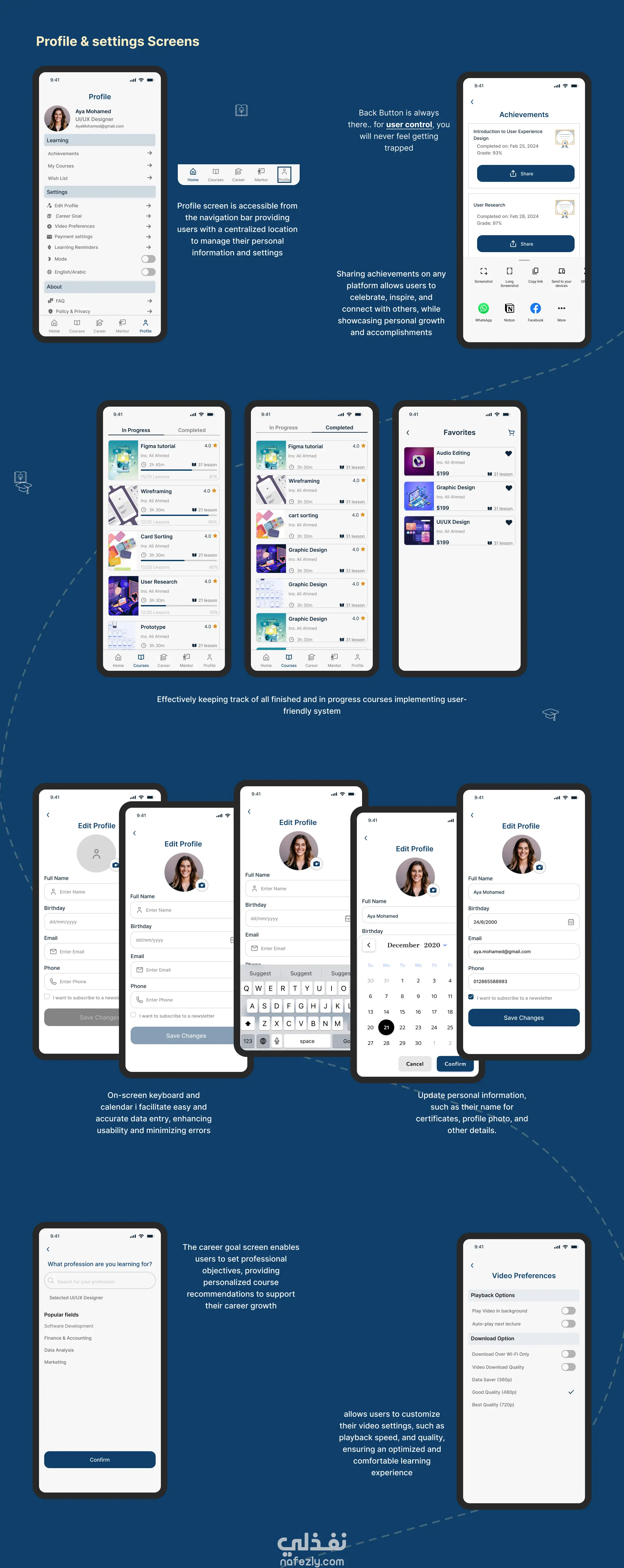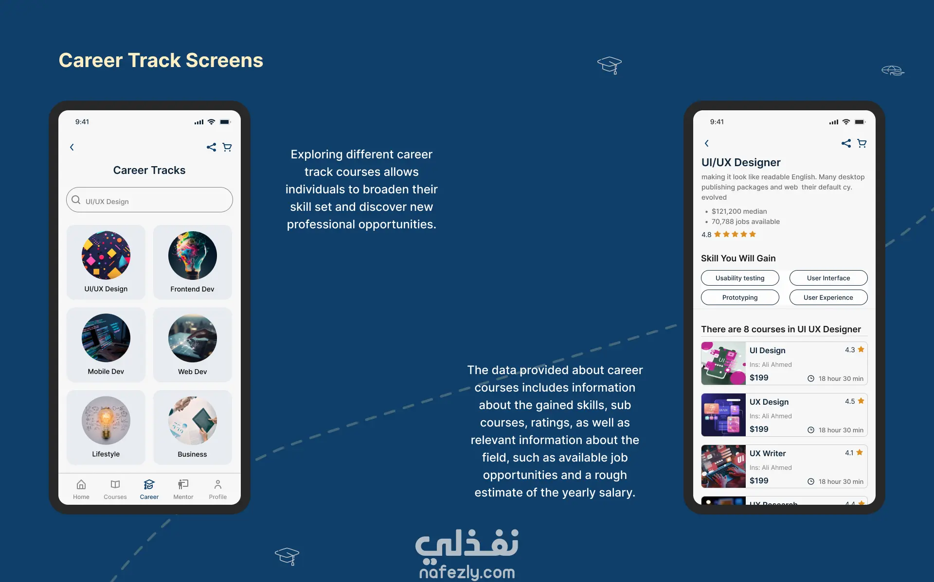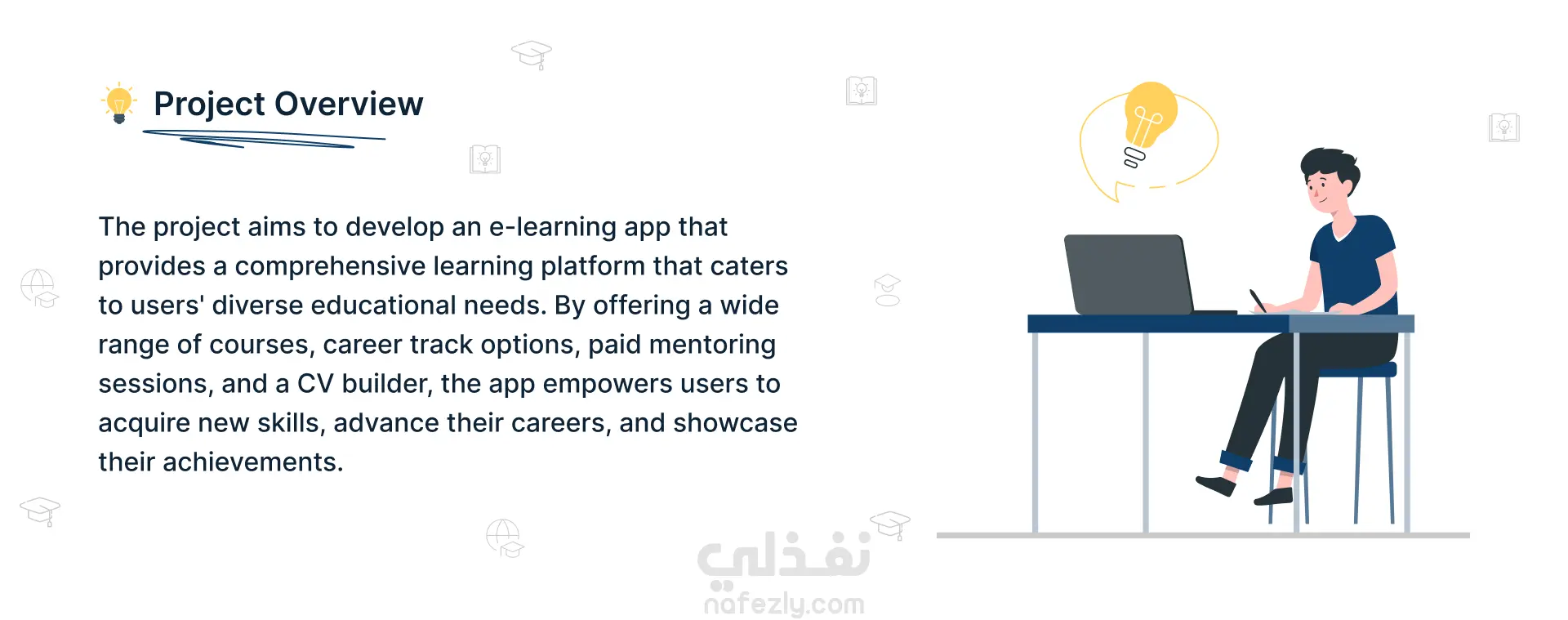 يهدف المشروع إلى تطوير تطبيق للتعليم الإلكتروني يقدّم منصة تعليمية شاملة تلبي الاحتياجات التعليمية المتنوعة للمستخدمين. من خلال توفير مجموعة واسعة من الدورات التدريبية، وخيارات مسارات مهنية، وجلسات إرشاد مدفوعة، وأداة لإنشاء السيرة الذاتية، يمكّن التطبيق المستخدمين من اكتساب مهارات جديدة، وتطوير مساراتهم المهنية، وعرض إنجازاتهم.