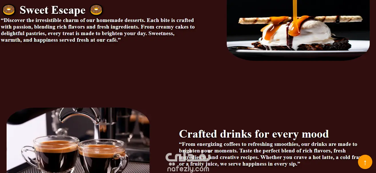 صممت وبرمجت موقعًا أنيقًا لكافيه يعرض المنيو، صور المنتجات، وأقسام التواصل والحجز. استخدمت HTML، CSS، وJavaScript لإنشاء تصميم متجاوب يتناسب مع جميع الشاشات. يتميز الموقع بتأثيرات حركة خفيفة (Animations) وتجربة مستخدم سلسة تعكس هوية الكافيه.