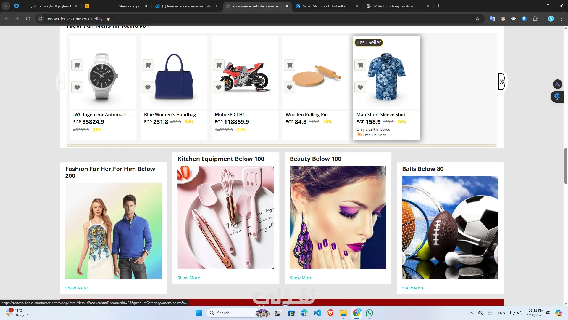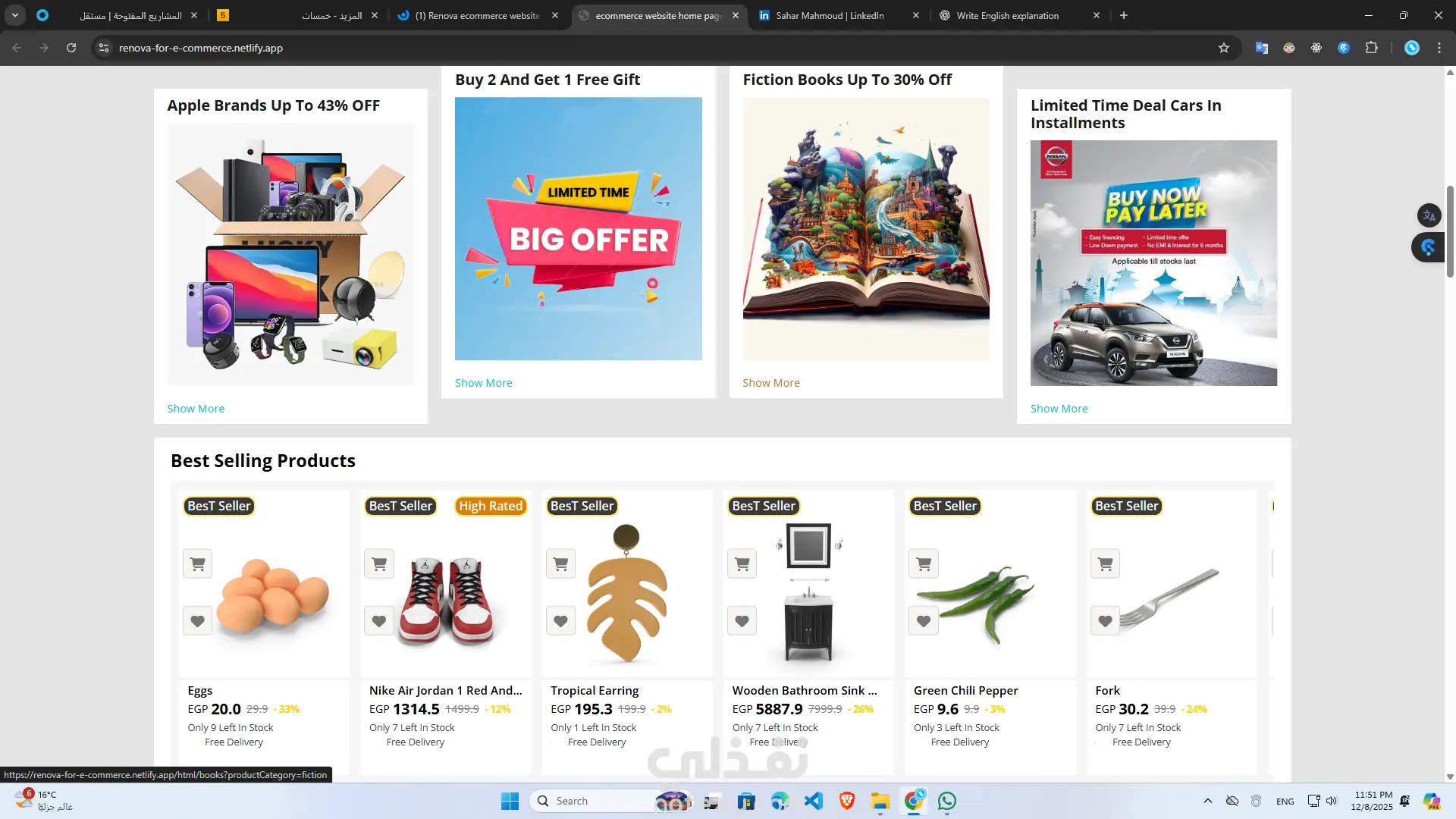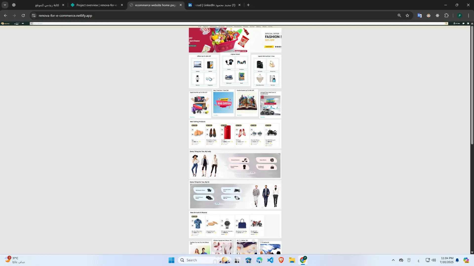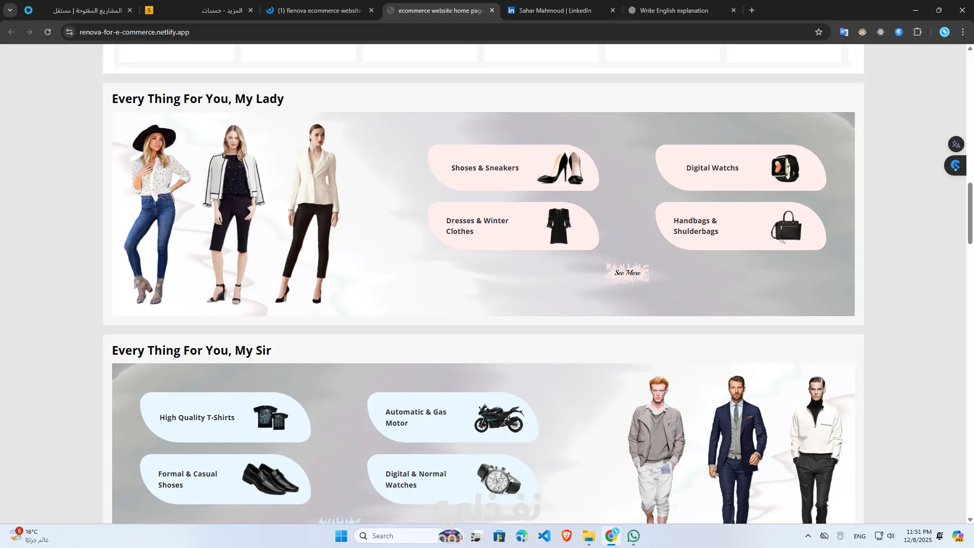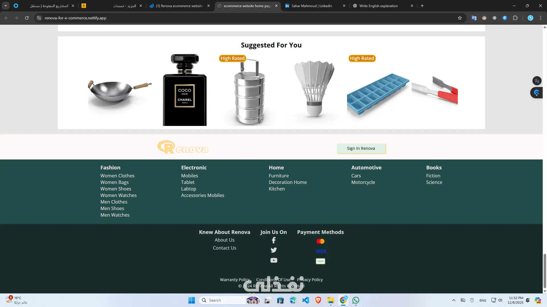 Developed my fifth project, Renova, a modern and fully responsive e-commerce website built entirely using HTML, CSS, and vanilla JavaScript without any frameworks or external libraries. -Designed the complete UI/UX, including navigation, product pages, product details, cart, and checkout flow. -Integrated a fake API to fetch and display products dynamically, simulating real e-commerce data. -Implemented advanced JavaScript features such as product filtering, search functionality, and interactive cart management. -Built a full authentication system, including account registration and user login using JavaScript and browser-based data handling. -Added bilingual support (English & Arabic) and used Google tools to assist in translating the website content from English to Arabic and vice versa. -Ensured full responsiveness, smooth interactions, and a consistent experience across different devices. -Optimized performance, accessibility, and loading speed. This project was a major milestone in my journey, allowing me to build a nearly complete e-commerce platform and apply a wide range of JavaScript techniques, which boosted my confidence significantly compared to previous projects.