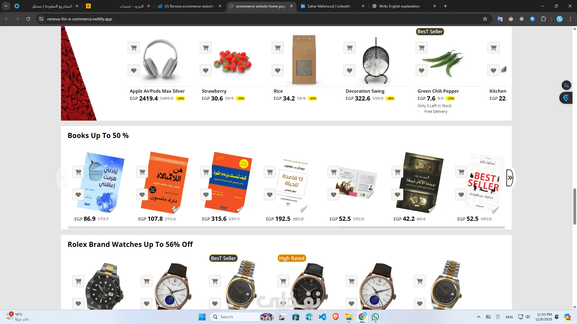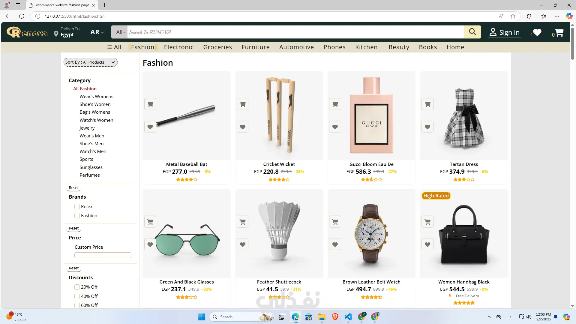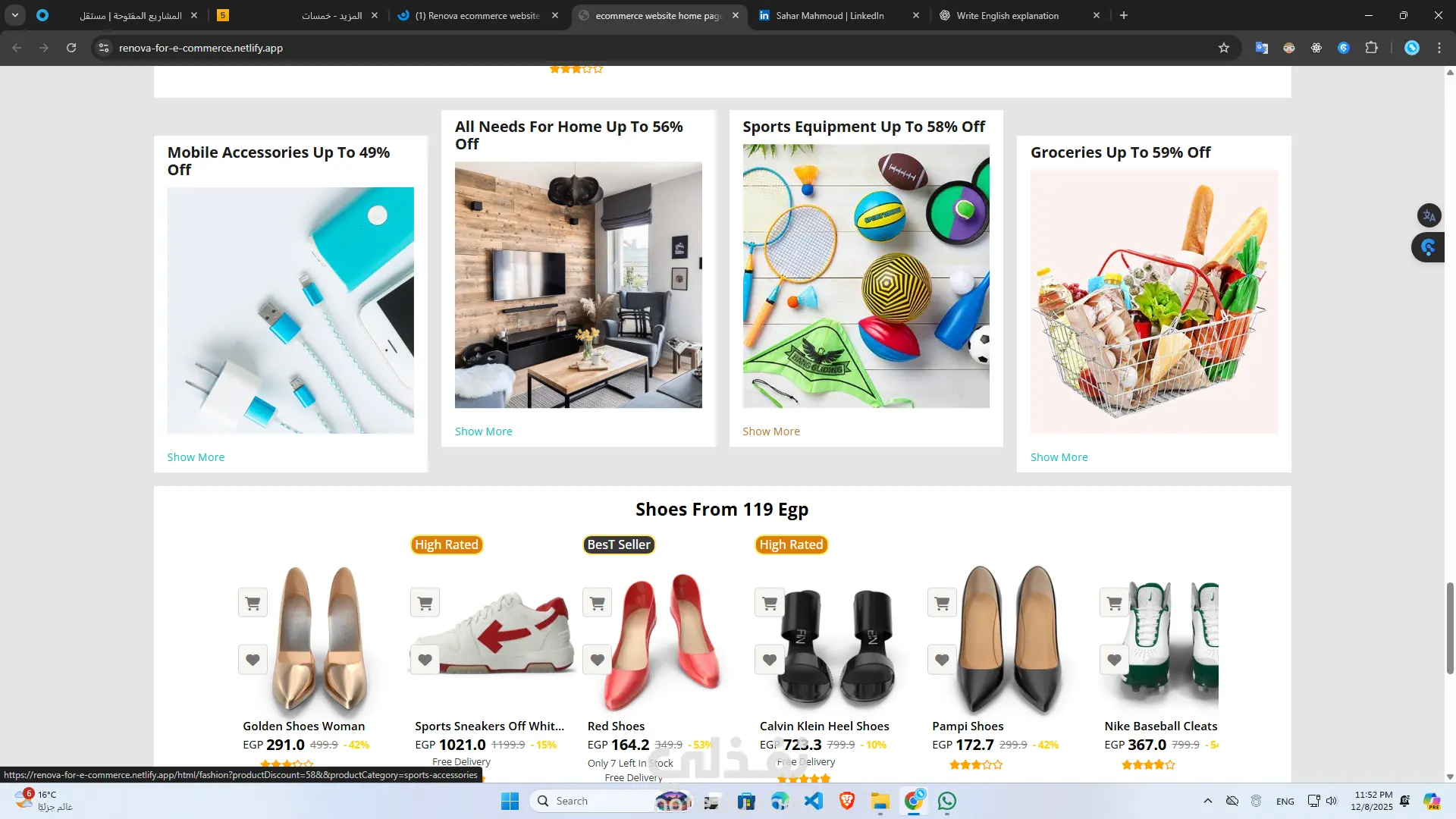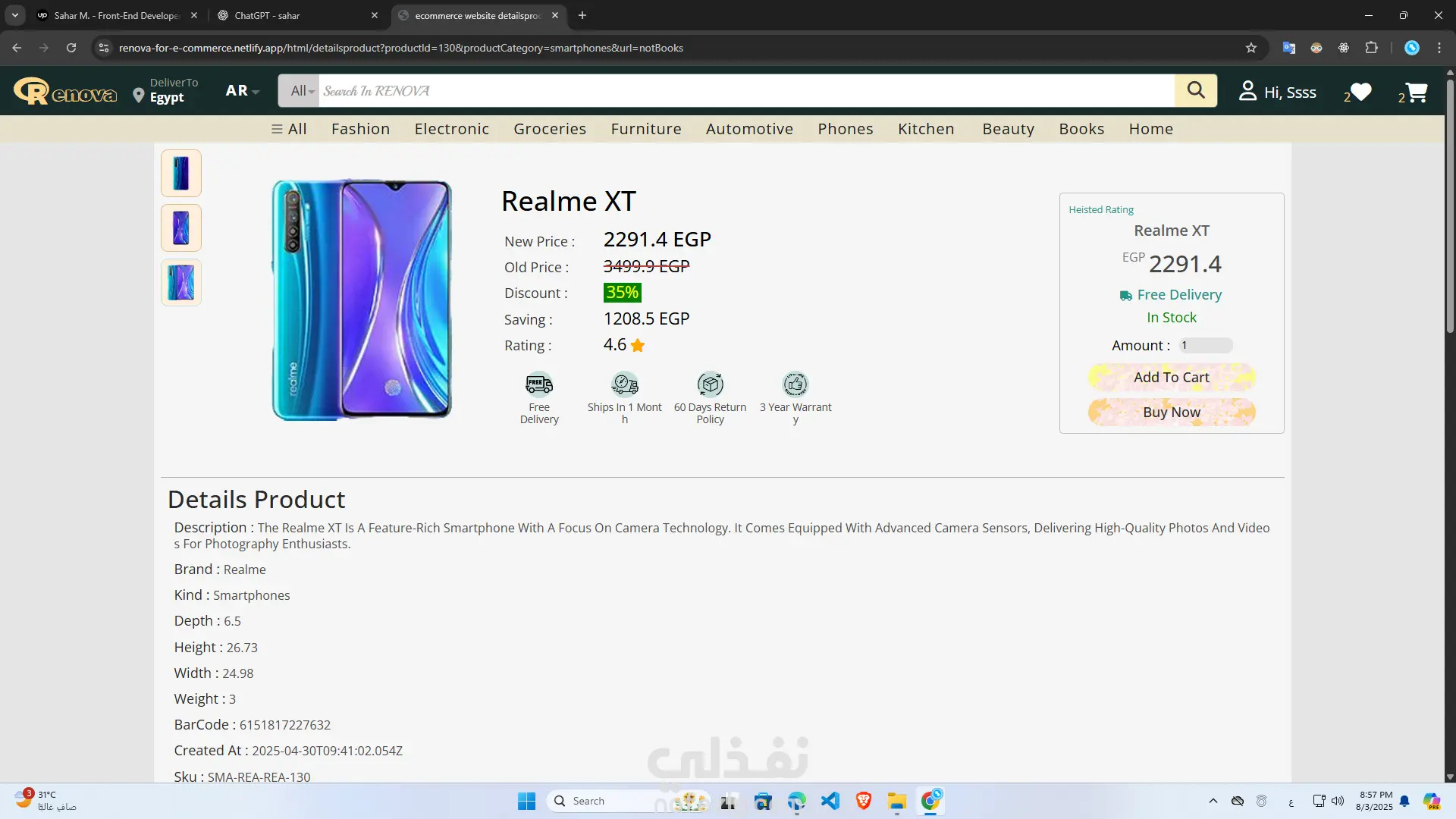 Developed my fifth project, Renova, a modern and fully responsive e-commerce website built entirely using HTML, CSS, and vanilla JavaScript without any frameworks or external libraries. -Designed the complete UI/UX, including navigation, product pages, product details, cart, and checkout flow. -Integrated a fake API to fetch and display products dynamically, simulating real e-commerce data. -Implemented advanced JavaScript features such as product filtering, search functionality, and interactive cart management. -Built a full authentication system, including account registration and user login using JavaScript and browser-based data handling. -Added bilingual support (English & Arabic) and used Google tools to assist in translating the website content from English to Arabic and vice versa. -Ensured full responsiveness, smooth interactions, and a consistent experience across different devices. -Optimized performance, accessibility, and loading speed. This project was a major milestone in my journey, allowing me to build a nearly complete e-commerce platform and apply a wide range of JavaScript techniques, which boosted my confidence significantly compared to previous projects.