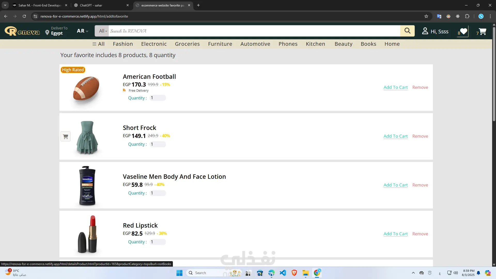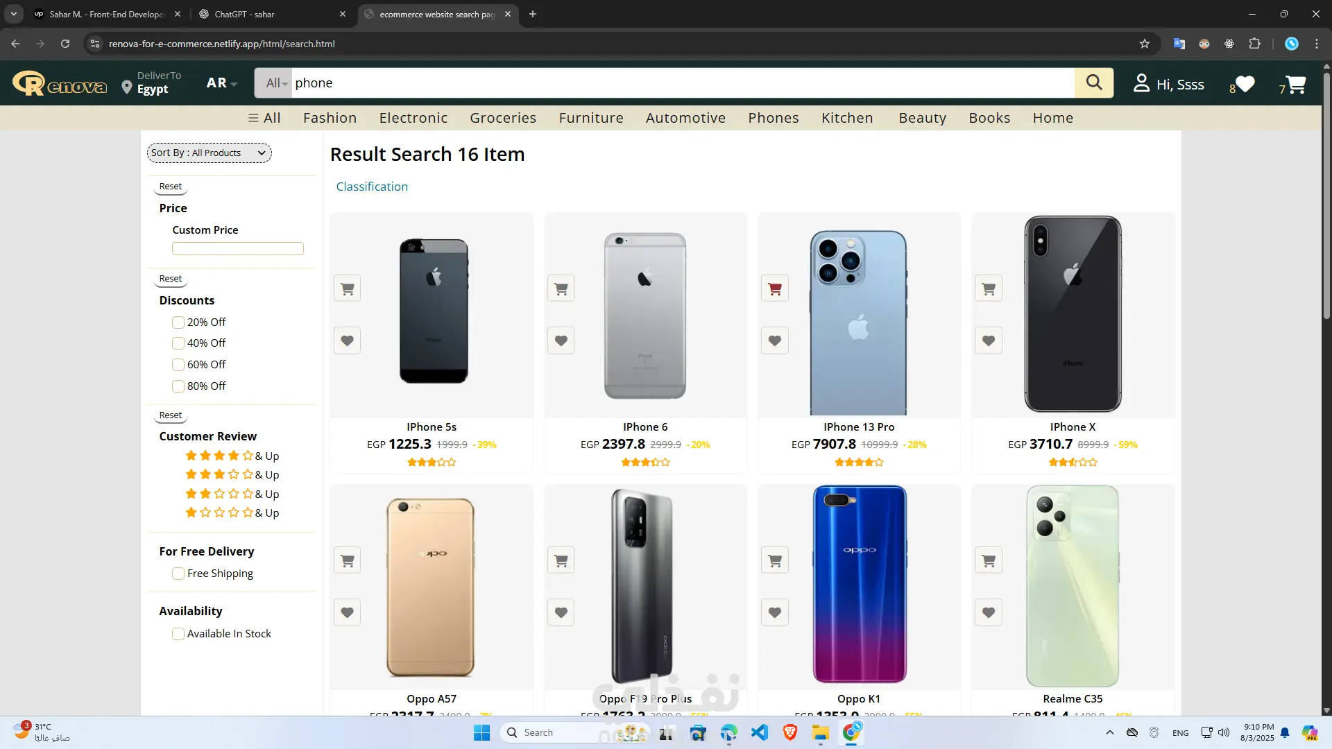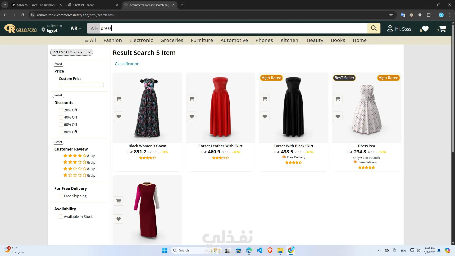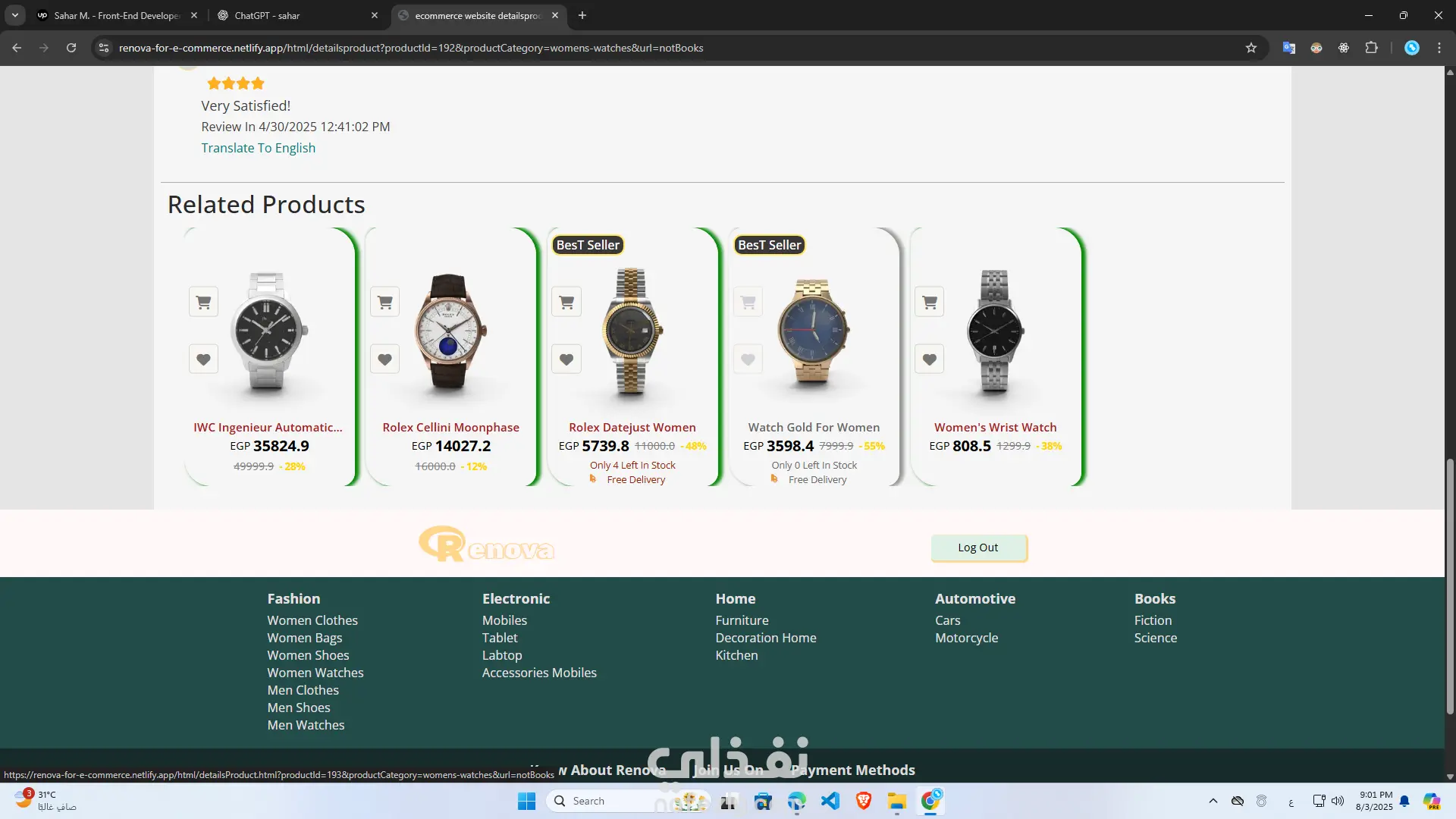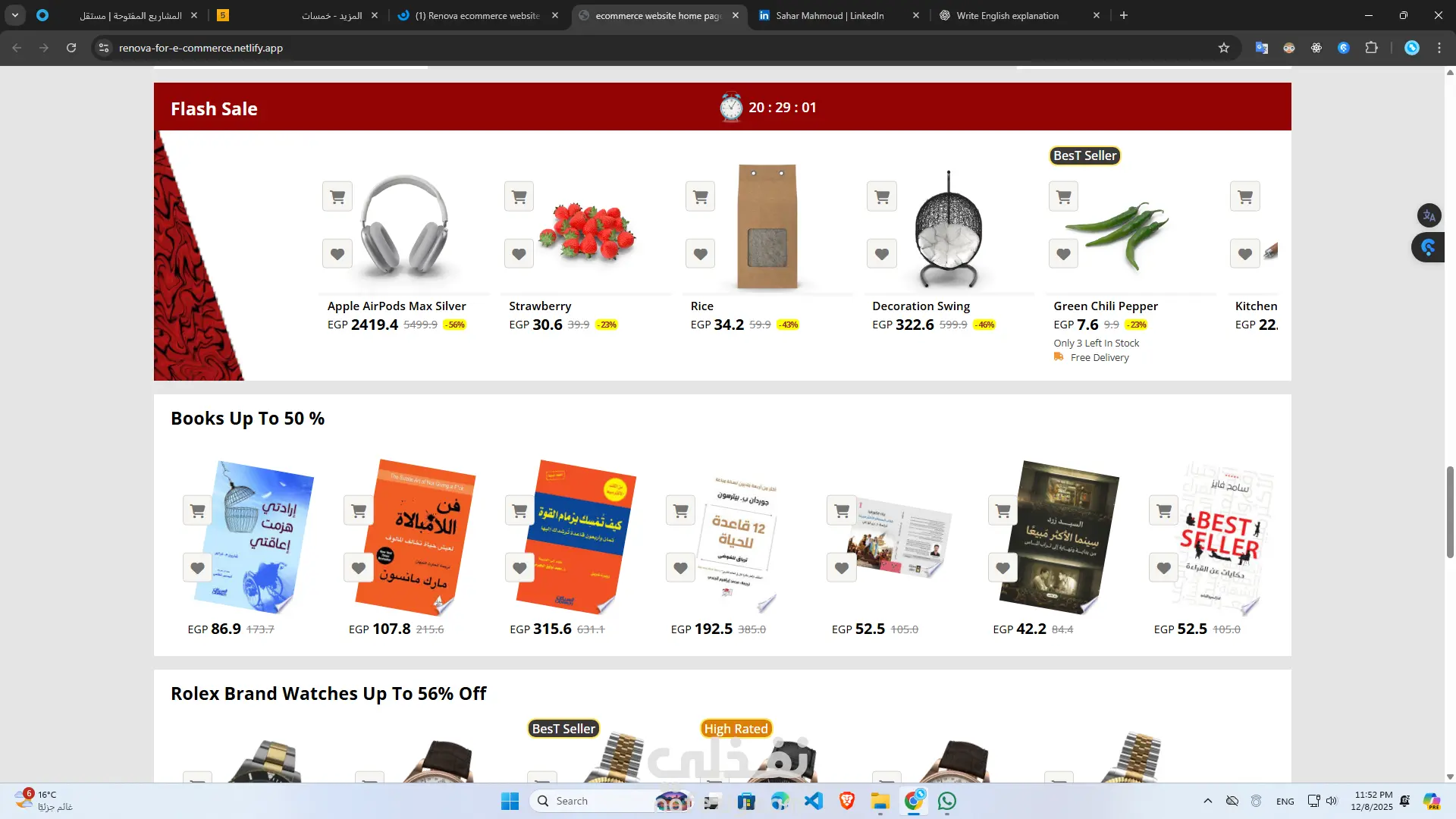 Developed my fifth project, Renova, a modern and fully responsive e-commerce website built entirely using HTML, CSS, and vanilla JavaScript without any frameworks or external libraries. -Designed the complete UI/UX, including navigation, product pages, product details, cart, and checkout flow. -Integrated a fake API to fetch and display products dynamically, simulating real e-commerce data. -Implemented advanced JavaScript features such as product filtering, search functionality, and interactive cart management. -Built a full authentication system, including account registration and user login using JavaScript and browser-based data handling. -Added bilingual support (English & Arabic) and used Google tools to assist in translating the website content from English to Arabic and vice versa. -Ensured full responsiveness, smooth interactions, and a consistent experience across different devices. -Optimized performance, accessibility, and loading speed. This project was a major milestone in my journey, allowing me to build a nearly complete e-commerce platform and apply a wide range of JavaScript techniques, which boosted my confidence significantly compared to previous projects.