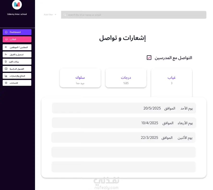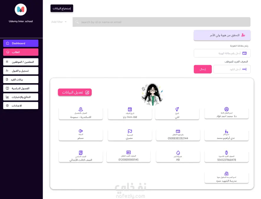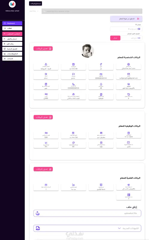 قمت بتصميم وتطوير موقع خاص بمدرسة لعرض حالة الطالب والمعلم بشكل تفصيلي، مع واجهة تفاعلية تساعد الإدارة والطلاب على متابعة البيانات بسهولة. ركزت في المشروع على تنظيم المعلومات بشكل واضح وتحسين التجربة على جميع الأجهزة. يشمل الموقع: صفحة بيانات الطالب: الحالة الدراسية، حالة القيد، الصف، رقم القيد، والمعلومات الأساسية. صفحة بيانات المعلم: البيانات الشخصية، التخصص، الحالة الوظيفية. عرض مواعيد الاختبارات والجداول الخاصة بكل طالب بشكل منسّق وسهل التصفّح. لوحة معلومات بسيطة (Dashboard) للتنقل بين الصفحات والوصول السريع للبيانات. تصميم متجاوب بالكامل يناسب الموبايل والتابلت والكمبيوتر. تنفيذ باستخدام: HTML CSS JavaScript مع كتابة كود منظّم، نظيف، سهل التطوير والتعديل لاحقًا. الهدف من المشروع كان توفير واجهة مريحة وواضحة لعرض بيانات المدرسة بشكل احترافي، مع التركيز على بساطة الاستخدام وسرعة الوصول للمعلومات.