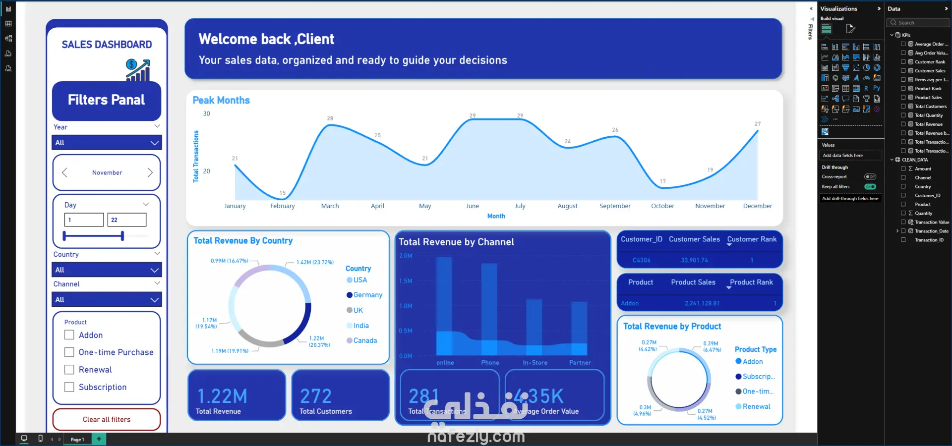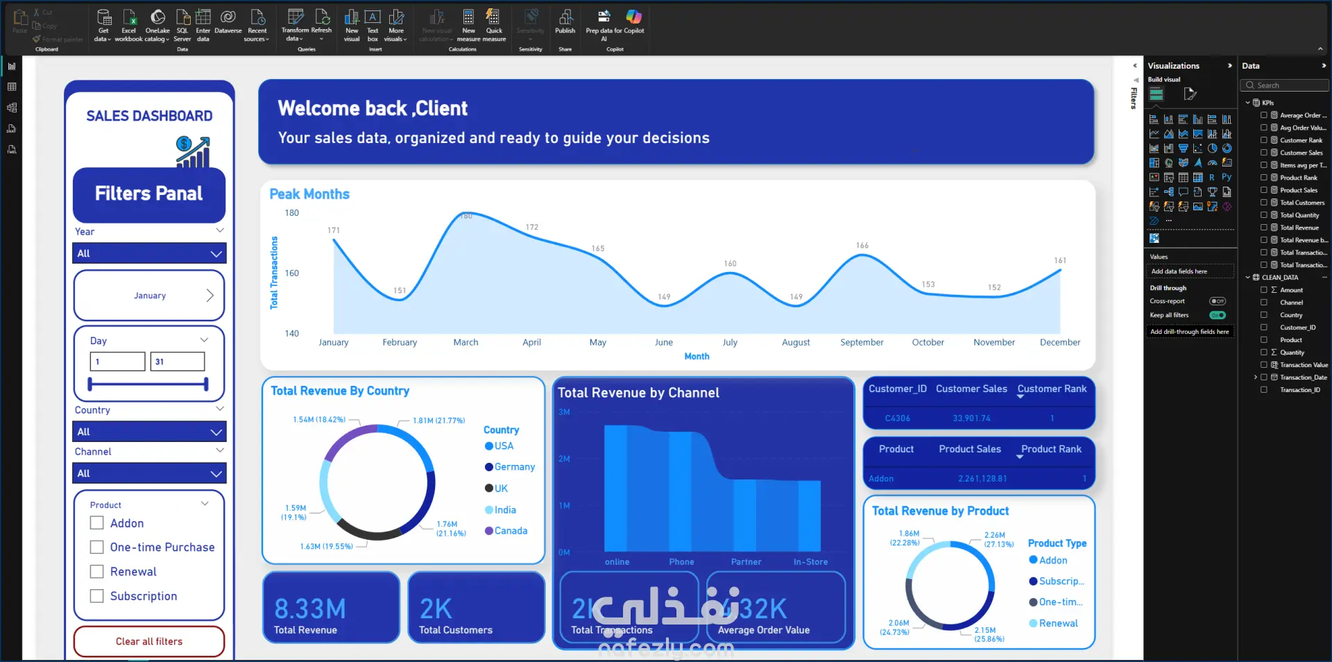 قمت بتطوير لوحة تحكم احترافية لبيانات المبيعات باستخدام Power BI، تهدف إلى تحليل أداء المبيعات بشكل شامل وسهل الفهم، مع تصميم بصري جذاب يناسبك كمتخذ قرار. تحتوي اللوحة على: ✔ تحليل شهري للمبيعات وتحديد أشهر الذروة ✔ مقارنة إجمالي الإيرادات حسب الدولة، المنتج، وقنوات البيع ✔ عرض قياسات أساسية (KPIs) مثل: إجمالي الإيرادات عدد العملاء عدد العمليات متوسط قيمة الطلب. ✔ فلاتر تفاعلية شاملة (السنة – الشهر – اليوم – المنتج – الدولة – القناة) ✔ جدول تفصيلي لبيانات العملاء والمنتجات ✔ تصميم احترافي منسق بعناية ومتوافق مع تجربة المستخدم يُمكن استخدام dashboard في: تقارير الإدارة اليومية متابعات الفريق التجاري تحليل اتجاهات السوق اتخاذ قرارات مبنية على بيانات دقيقة