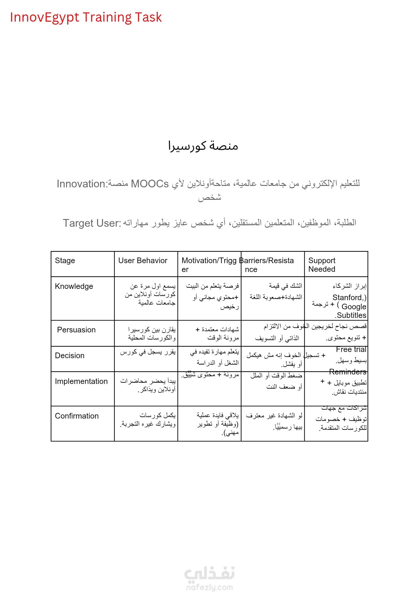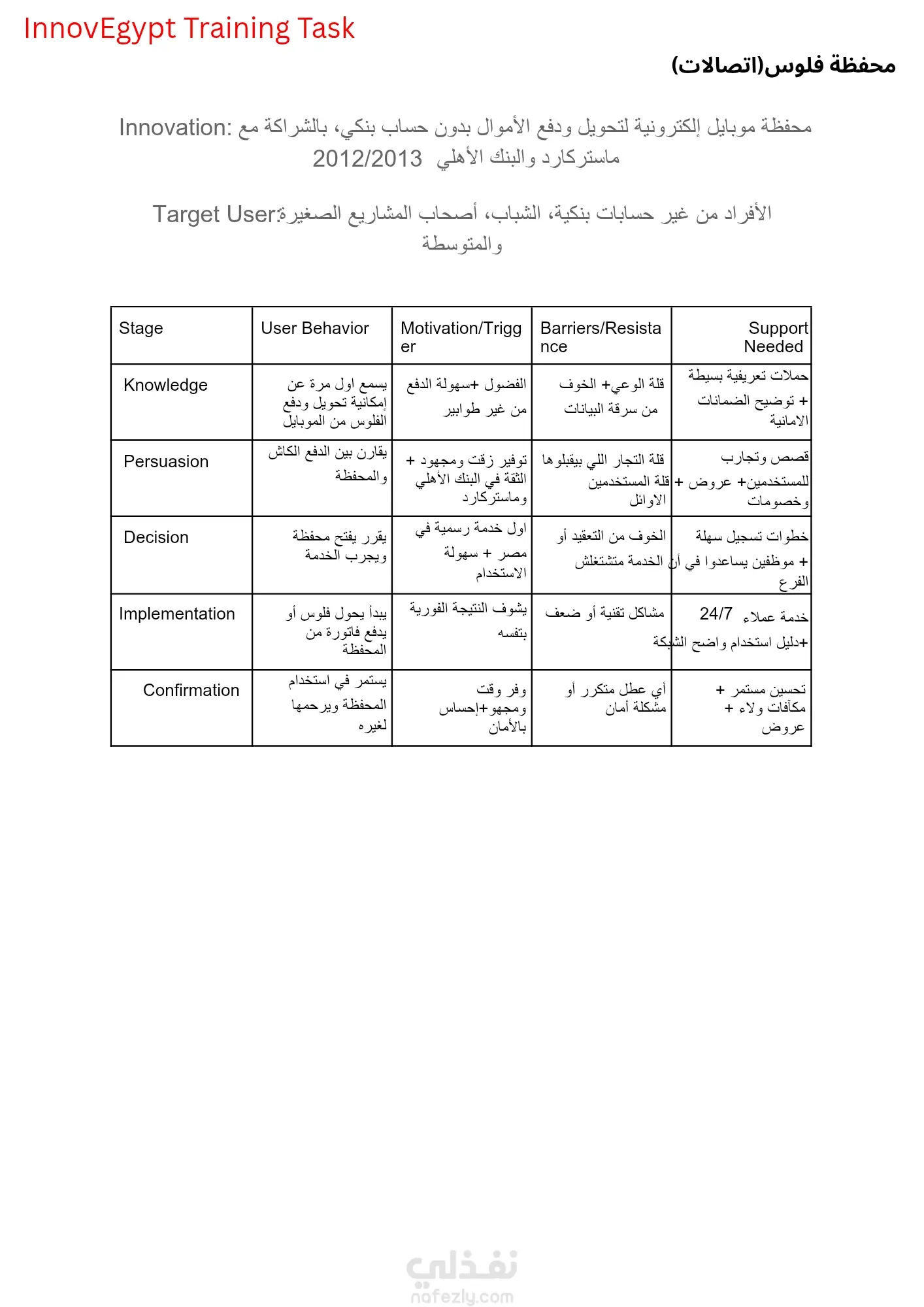 ده نموذج أولي قمت بإعداده لمشروع افتراضي في مجال ربط العملاء بالصنايعية الموثوقين. محتويات الملف: Empathy Map لتوضيح احتياجات وتحديات المستخدمين. Business Model Canvas متكامل بكل عناصره (القيمة، الشرائح، القنوات، الإيرادات… إلخ). تحليل مبدئي للسوق بالاعتماد على بيانات فعلية من أسوان. الهدف من الملف: إظهار قدرتي على تحليل السوق وفهم العميل بدقة. تحويل الأفكار الأولية إلى نماذج عملية قابلة للتنفيذ. تقديم مخرجات واضحة واحترافية تسهّل عملية اتخاذ القرارات +A task for analyzing innovation, target users, and the five stages of oppression, from knowledge to confirmation, for a wallet from Etisalat and the Coursera platform