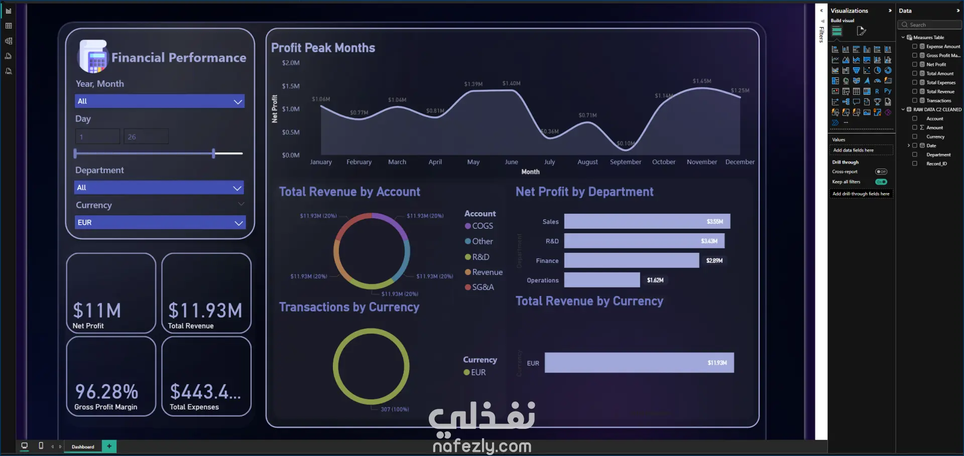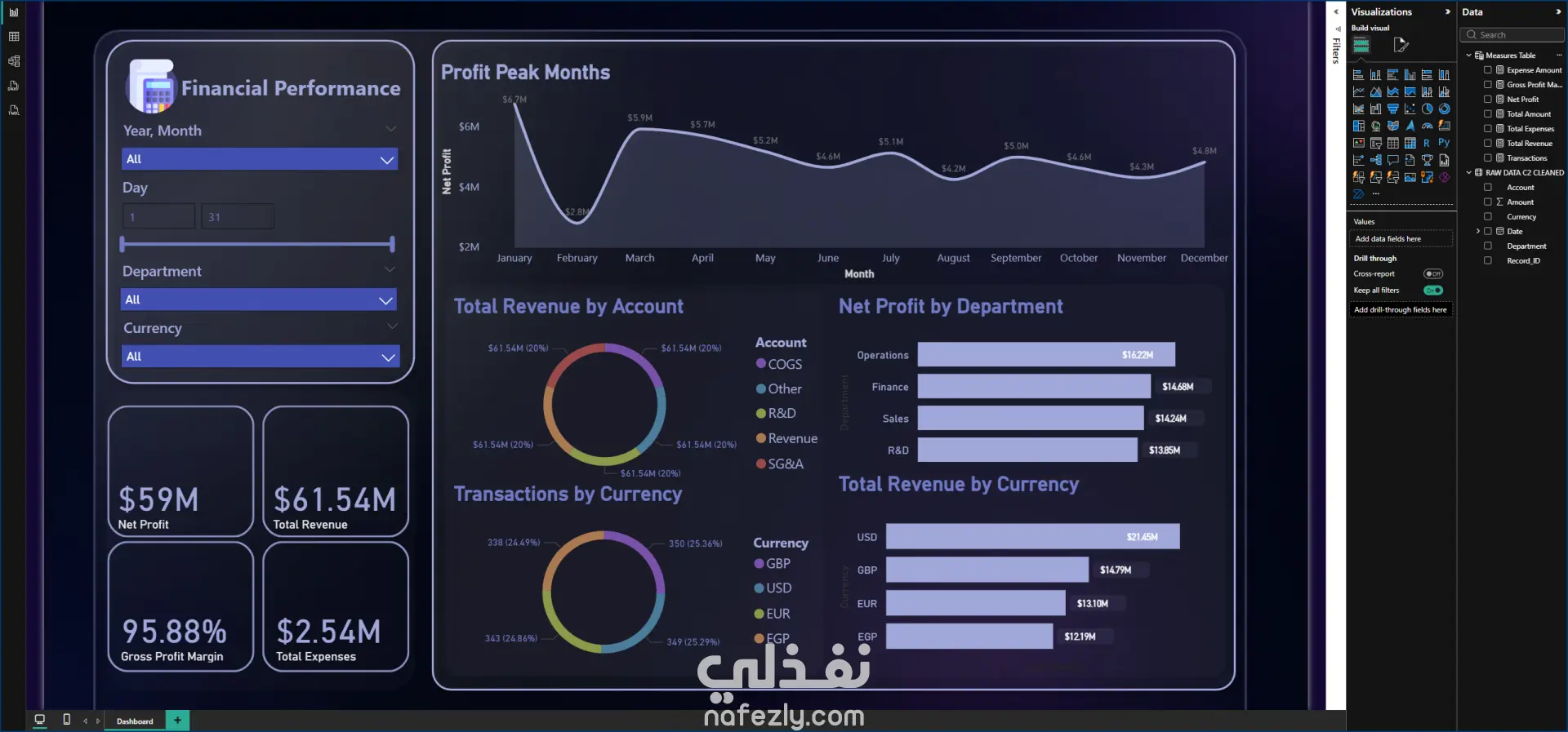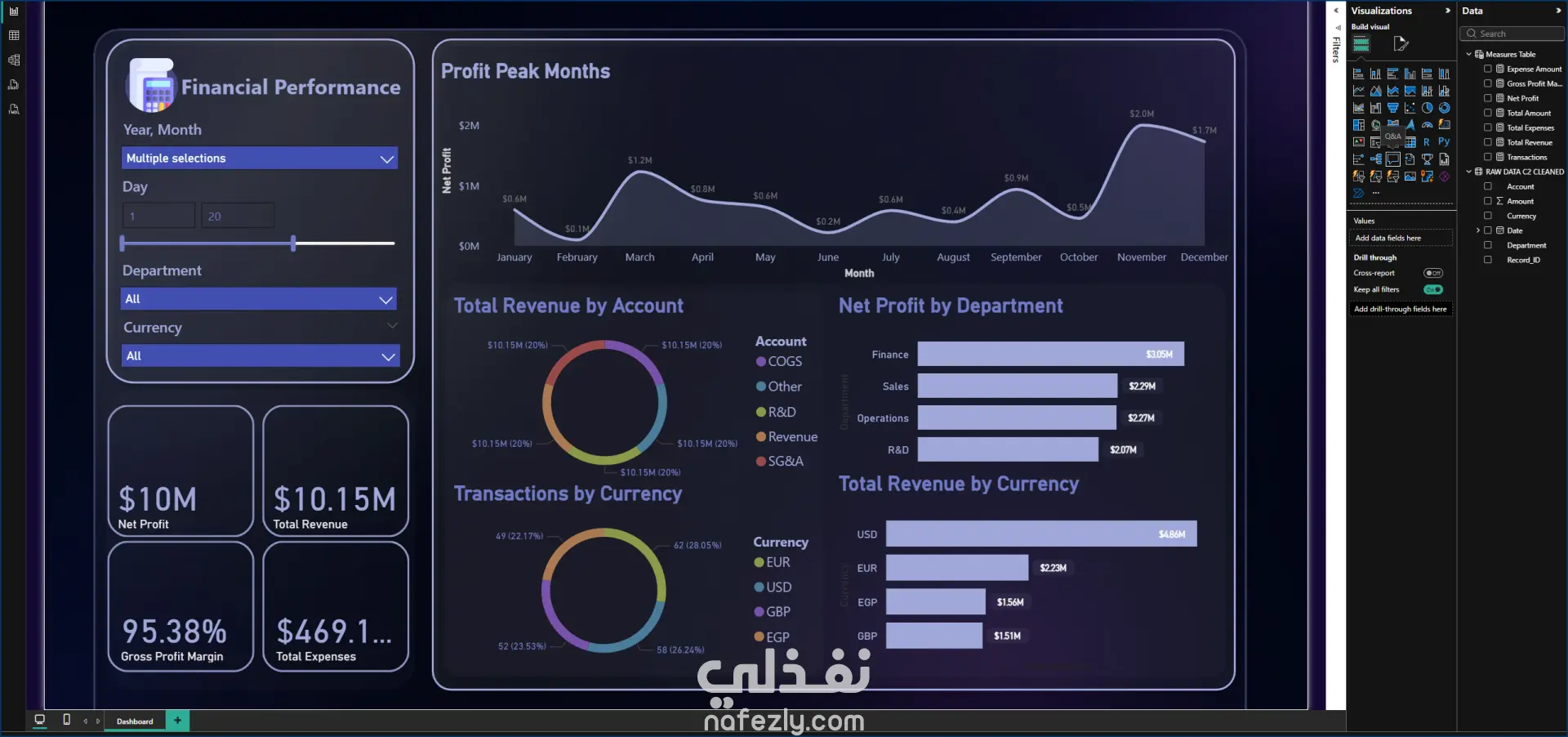 قمت بتطوير لوحة تحكم احترافية خاصة بالأداء المالي باستخدام Power BI، مصممة خصيصًا لتحليل الأرباح والإيرادات والمصاريف بشكل مرئي وسهل الفهم، مع دعم خيارات التصفية لتغطية فترات زمنية مختلفة وأقسام الشركة. تقدم اللوحة رؤى تحليلية تشمل: ✔ تحليل شهري لنمو الأرباح وتحديد أشهر الذروة ✔ مقارنة الأرباح حسب الأقسام (Operations – Finance – Sales – R&D) ✔ تحليل الإيرادات حسب الحسابات المالية ✔ توزيع المعاملات حسب العملات (USD – GBP – EUR – EGP) ✔ عرض مؤشرات رئيسية KPIs مثل: صافي الربح إجمالي الإيرادات إجمالي المصروفات هامش الربح ✔ دعم فلاتر تفاعلية (الشهر – اليوم – القسم – العملة) استخدام اللوحة مناسب لـ: التقارير المالية الدورية تقييم أداء الإدارات دعم اتخاذ القرار تتبع المصروفات والإيرادات بدقة تصميم الـ Dashboard مبني على واجهة حديثة، منظمة، وبسيطة في الاستخدام، مع رسوم بيانية متقدمة تساعد المستخدم على الوصول للمعلومة بسهولة وباحترافية.