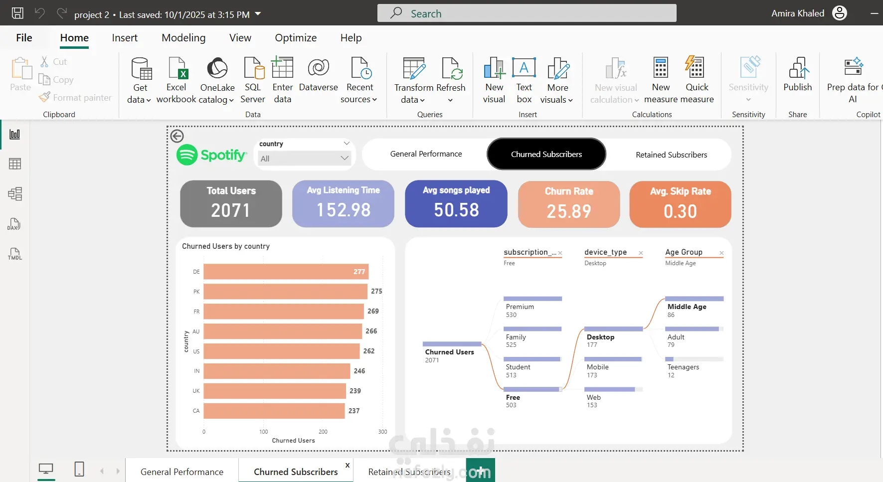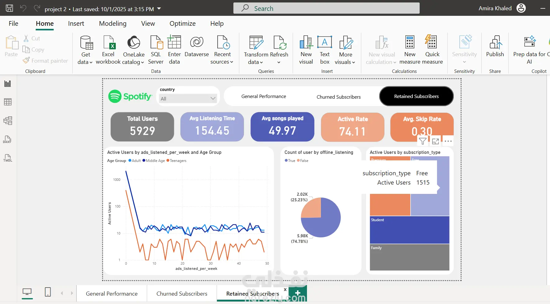 قمت بتنظيف وتحليل البيانات الخاصة بمستخدمي ابلكيشن spotify لمعرفة سلوك العملاء المستمرين وسلوك العملاء المغادرين وتحديد فئات العملاء المستهدفين للحملات الاعلانية وذلك باستخدام python ، وتوضيح هذه الرؤى عن طريق عمل داشبورد تفاعلية باستخدام power bi وكذلك انشاء machine learning models للتنبؤ هل العميل سيستمر في الاشتراك بالخدمة ام سيغادر؟ وايضا model لمعرفة عدد الاغاني المتوقع تشغيلها في اليوم