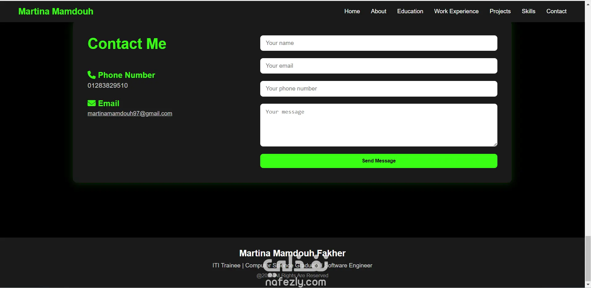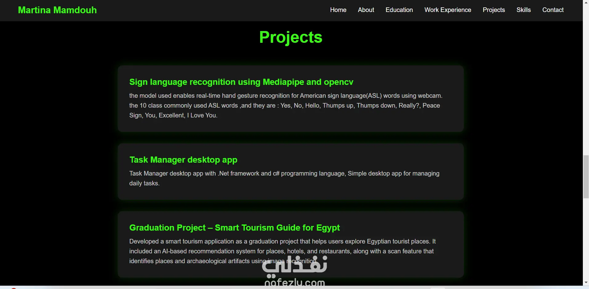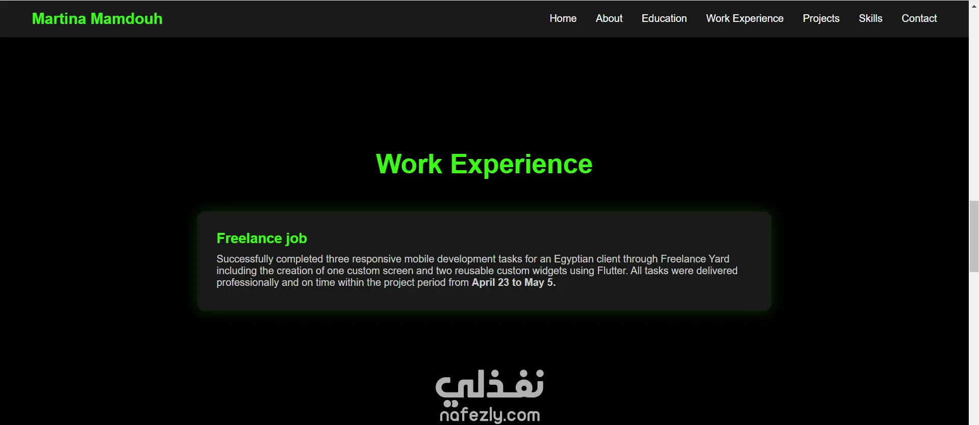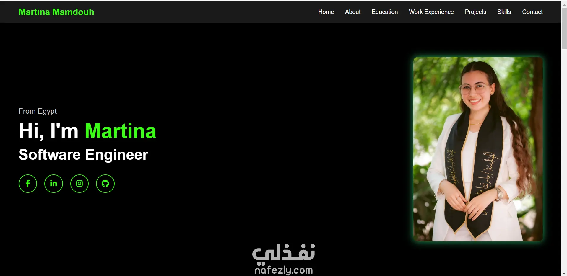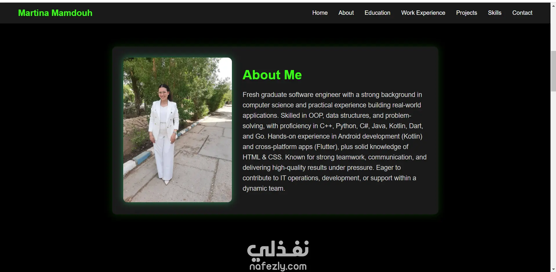 مشروع بورتفوليو شخصي يضم أقسام: Home, About Me, Education, Work Experience, Projects, Skills, وContact Me. تم تطويره باستخدام HTML وCSSو JS ليكون متجاوبًا ويعمل على جميع الأجهزة. الغرض من المشروع هو عرض خبراتي ومهاراتي ومشاريعي بشكل منظم وجذاب.