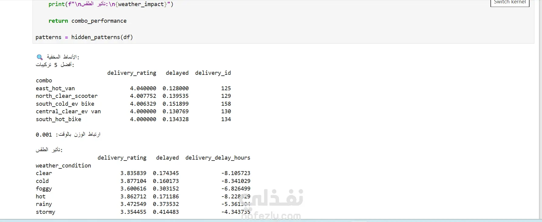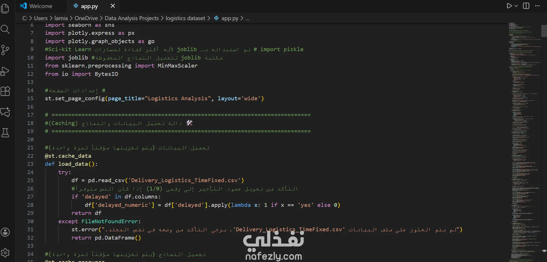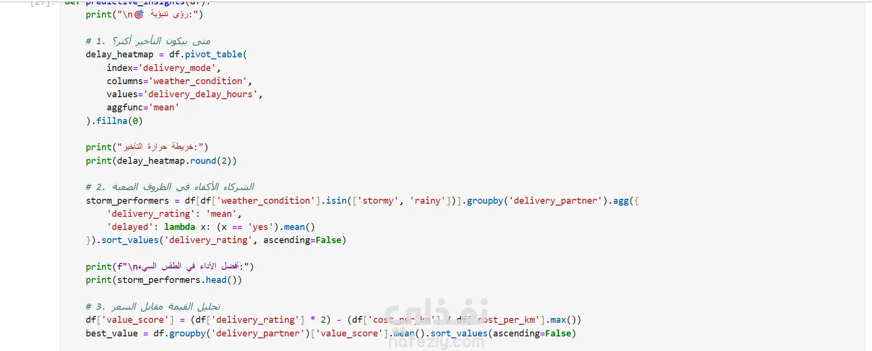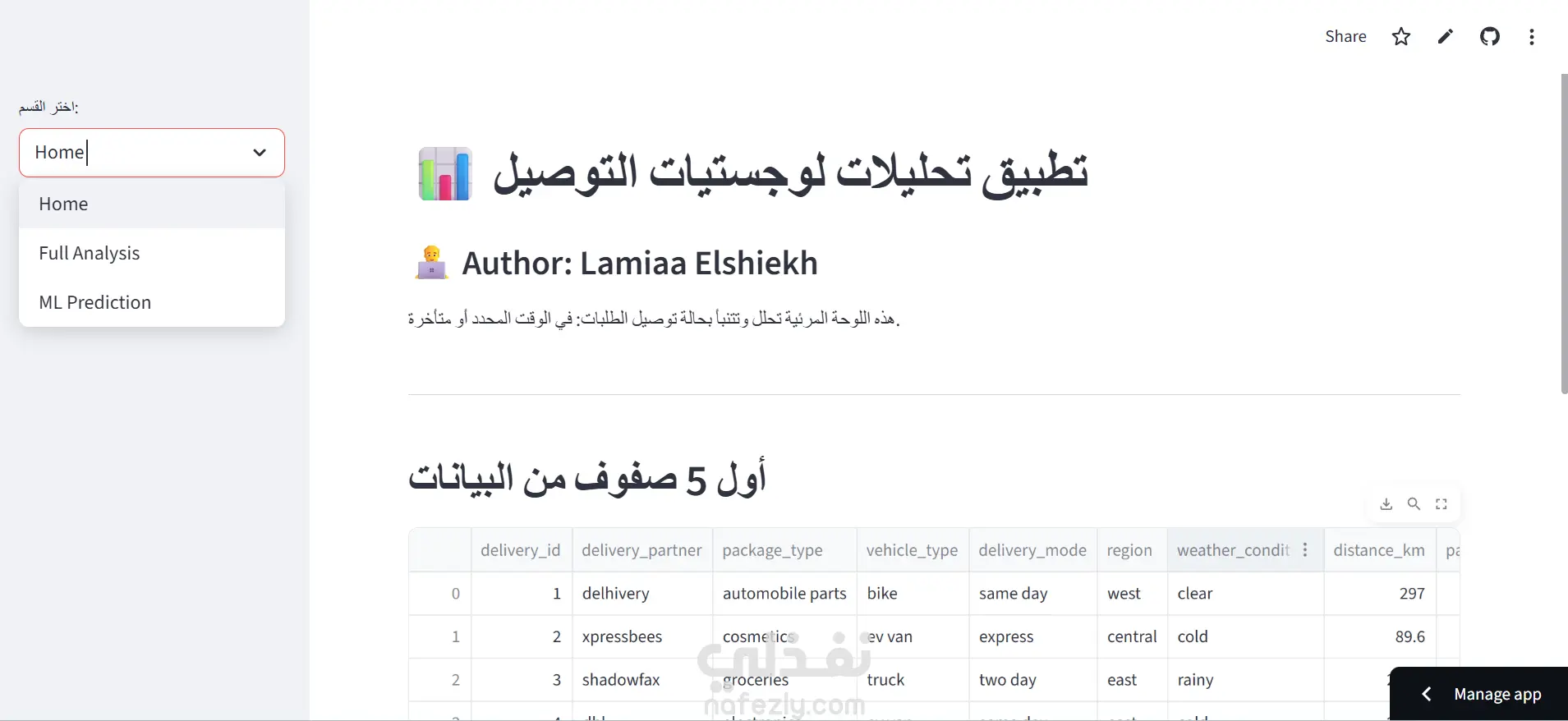 قمت بتظيف البيانات واستخراج مؤشرات اداء وتحليلات متقدمة لفهم اداء الشركات في لكل منطقة وفي جميع ظروف الطقس وغيرها من التحليلات الدقيقة وكذلك تصميم ونشر مسارات تعلّم آلي قوية. ومتكاملة للتنبؤ بأداء التوصيل. الحل الذي أقدمه هو لوحة تحكم تفاعلية مدعومة بمنصة Streamlit، وتوفر نوعين من الرؤى التنبؤية الحاسمة: الانحدار (Regression): تنبؤ دقيق بـ delivery_delay_hours (ساعات تأخير التوصيل) لتمكين الإدارة الاستباقية للتأخيرات. التصنيف (Classification): تحديد احتمالية تصنيف الشحنة على أنها 'متأخرة' أو 'في الوقت المحدد'.