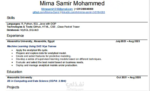 عمل سيرة ذاتية احترافية متوافقة مع نظام الـ ATS . نحتاج الى المعلومات التالية: 1. المعلومات الشخصية الاسم الثلاثي البريد الإلكتروني رقم الهاتف المدينة / الدولة رابط LinkedIn (لو موجود) 2. المسمّى الوظيفي المراد التقديم عليه (مثال: Data Analyst – Software Engineer – Accountant) 3. ملخص احترافي (Summary) – لو مش عندك، اكتبهولك أنا. 4. الخبرات العملية (Work Experience) لكل وظيفة: المسمّى الوظيفي اسم الشركة الفترة أهم الإنجازات والمهام (3–5 نقاط) 5. التعليم (Education) الدرجة العلمية الجامعة سنة التخرج 6. المهارات (Skills) تقنية + شخصية 7. الدورات (Courses / Certifications) الاسم + الجهة 8. المشاريع (Projects) لو في مشاريع جامعية أو شخصية وهكذ تكون جاهز لعمل سيرة ذاتية بنظام ATS 100% منظمة وبخط واضح كلمات مفتاحية مناسبة لمجالك تنسيق قوي جاهز للنسخ أو التحويل لـ PDF