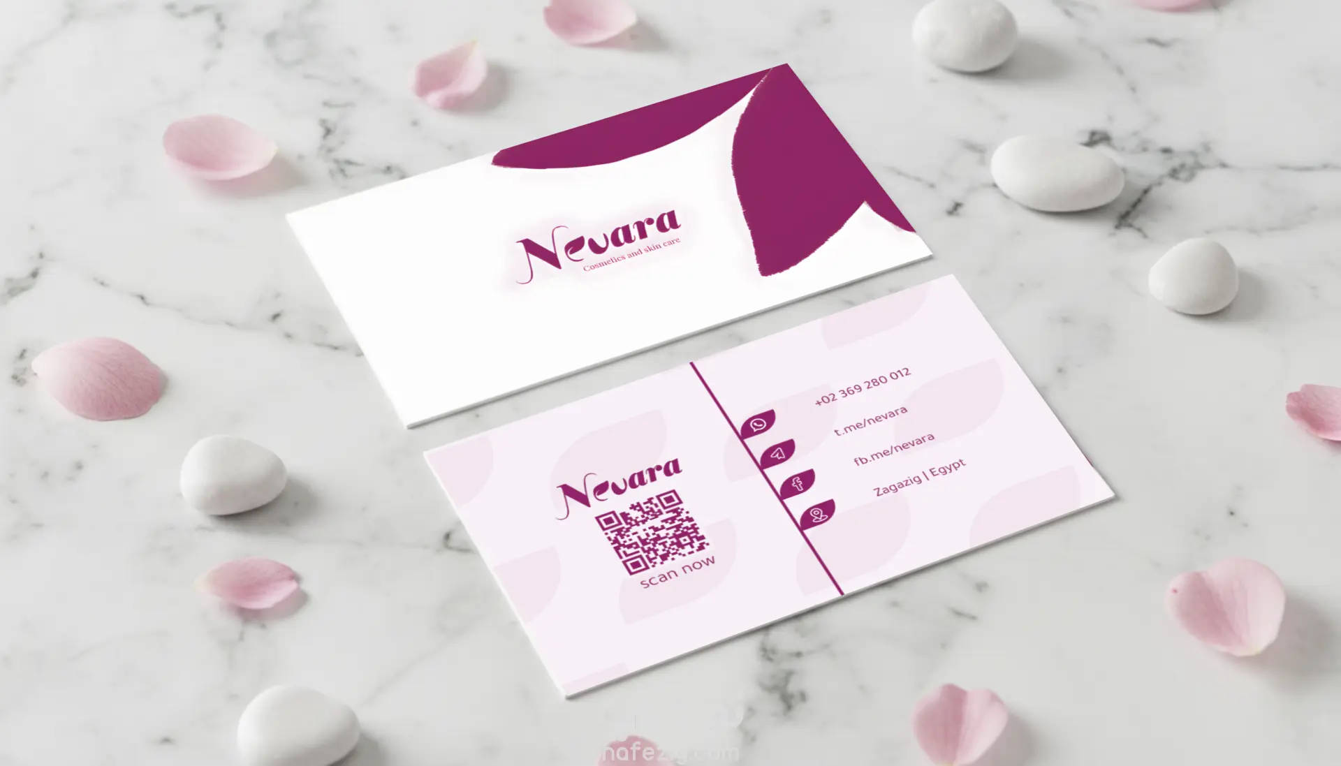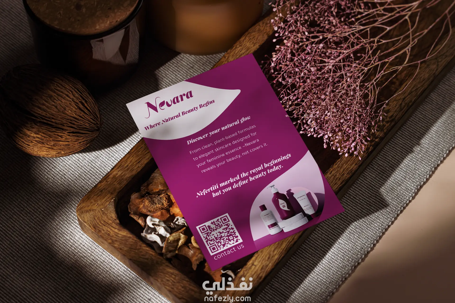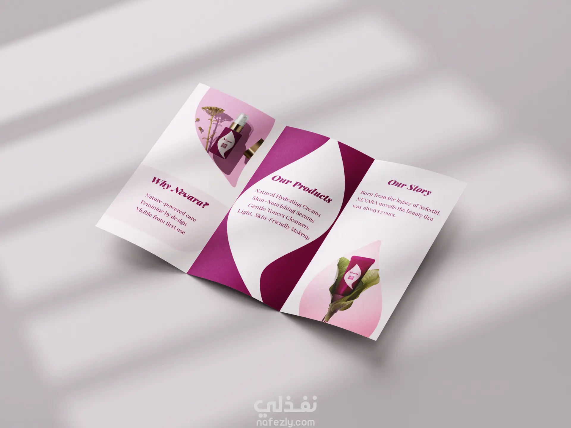 مشروع تصميم هوية Nevara للعناية بالبشرة (لوجو + كارت + بروشور + فلاير)