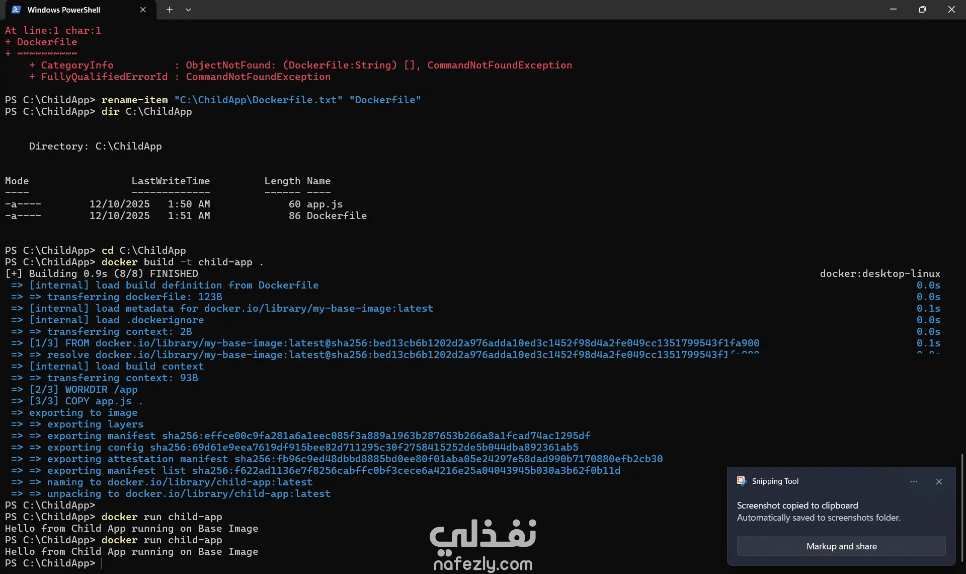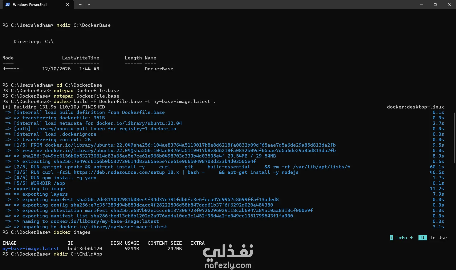 بناء صورة Docker أساسية (Base Image) تحتوي على أدوات تطوير مثل Node.js و npm و Yarn و Git، ثم إنشاء مشروع فرعي يستخدم هذه الصورة كأساس. المشروع يوضح سهولة إعادة استخدام الصورة الأساسية في مشاريع أخرى.