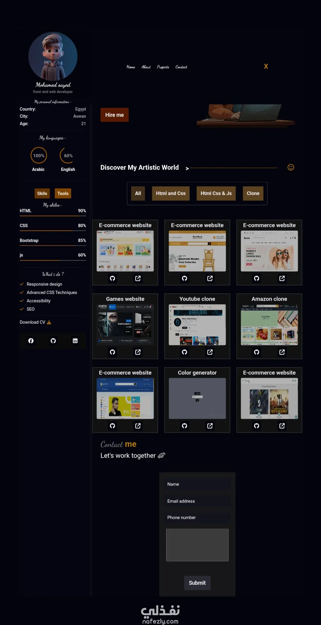 هذا موقع شخصي يمكنك من خلاله عرض الأعمال التي قمت بها لعملائك، ليتمكنوا من الاطّلاع على مهاراتك وأعمالك السابقة قبل العمل معك.