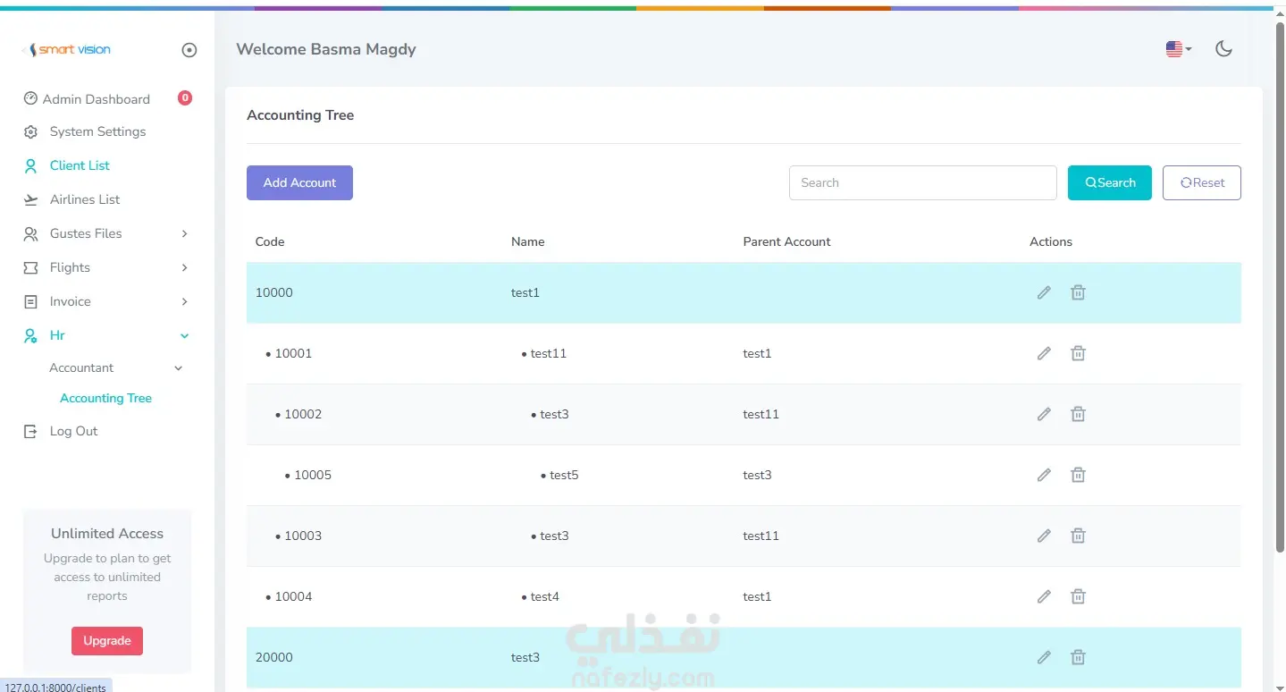 Users can add, edit, delete, and view accounts with a clear hierarchy.