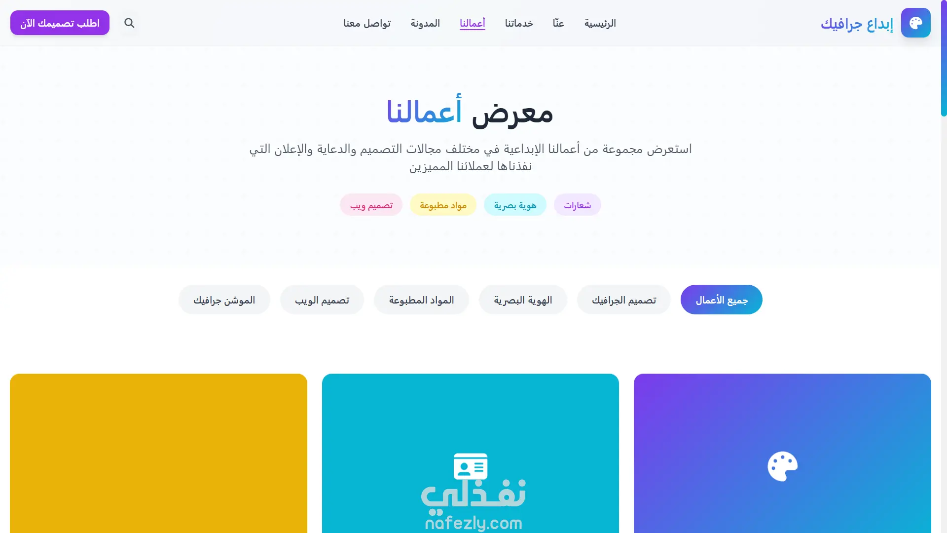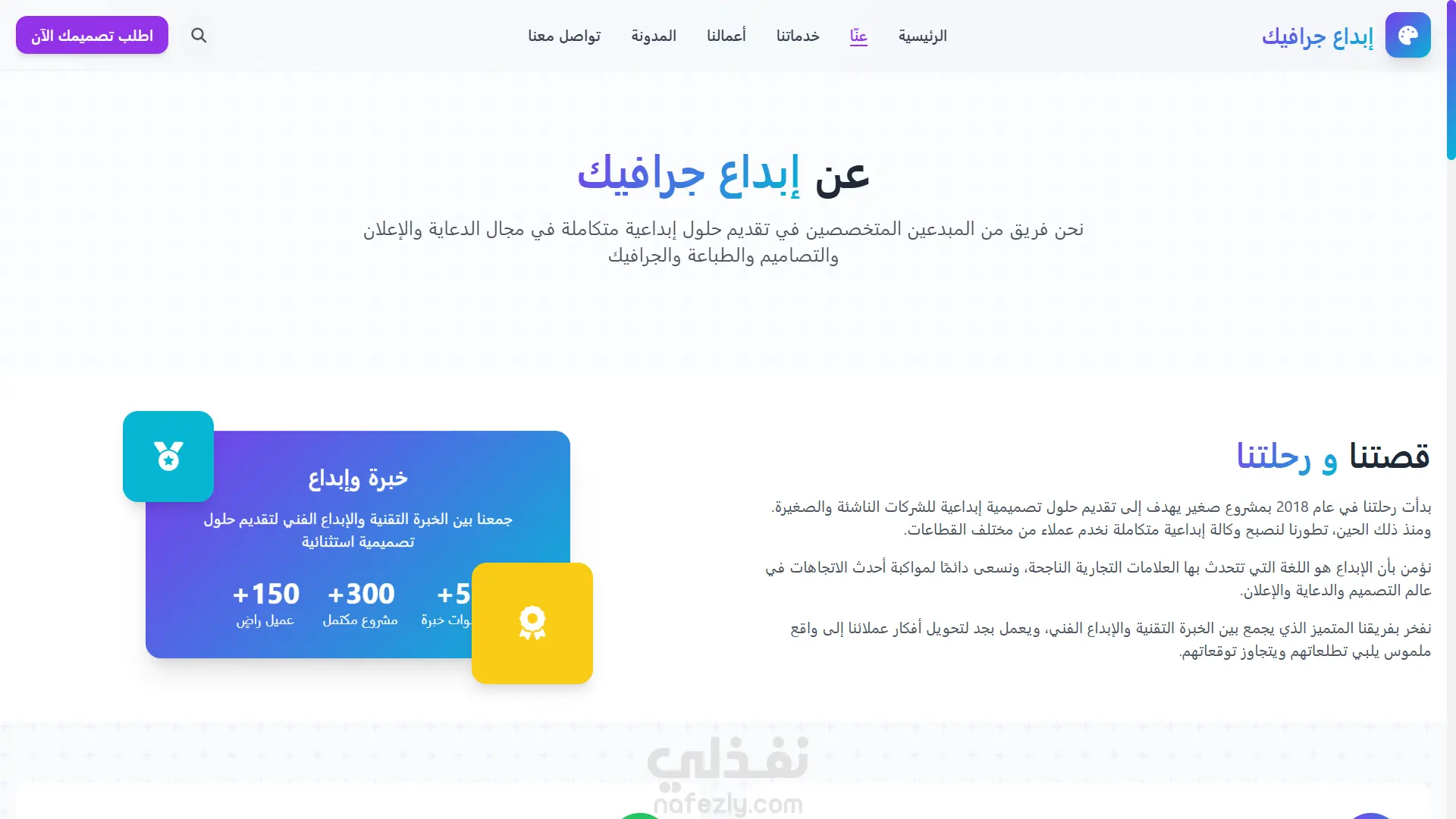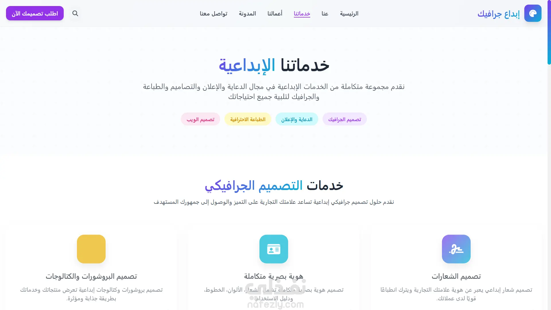 الشعار: "إبداع لا حدود له في عالم التصميم" يعبر عن رؤية الموقع في تقديم إبداع غير تقليدي. الرسالة: تحويل أفكار العملاء إلى واقع ملموس بلمسة إبداعية واحترافية. الهيكل: يحتوي على أقسام واضحة (الرئيسية، من نحن، الخدمات، معرض الأعمال، المدونة، اتصل بنا) مما يسهل على الزائر العثور على ما يحتاجه. الهدف: جذب العملاء من خلال عرض الخدمات المتكاملة والتشجيع على مشاهدة مشاريع سابقة ("شاهد أعمالنا")