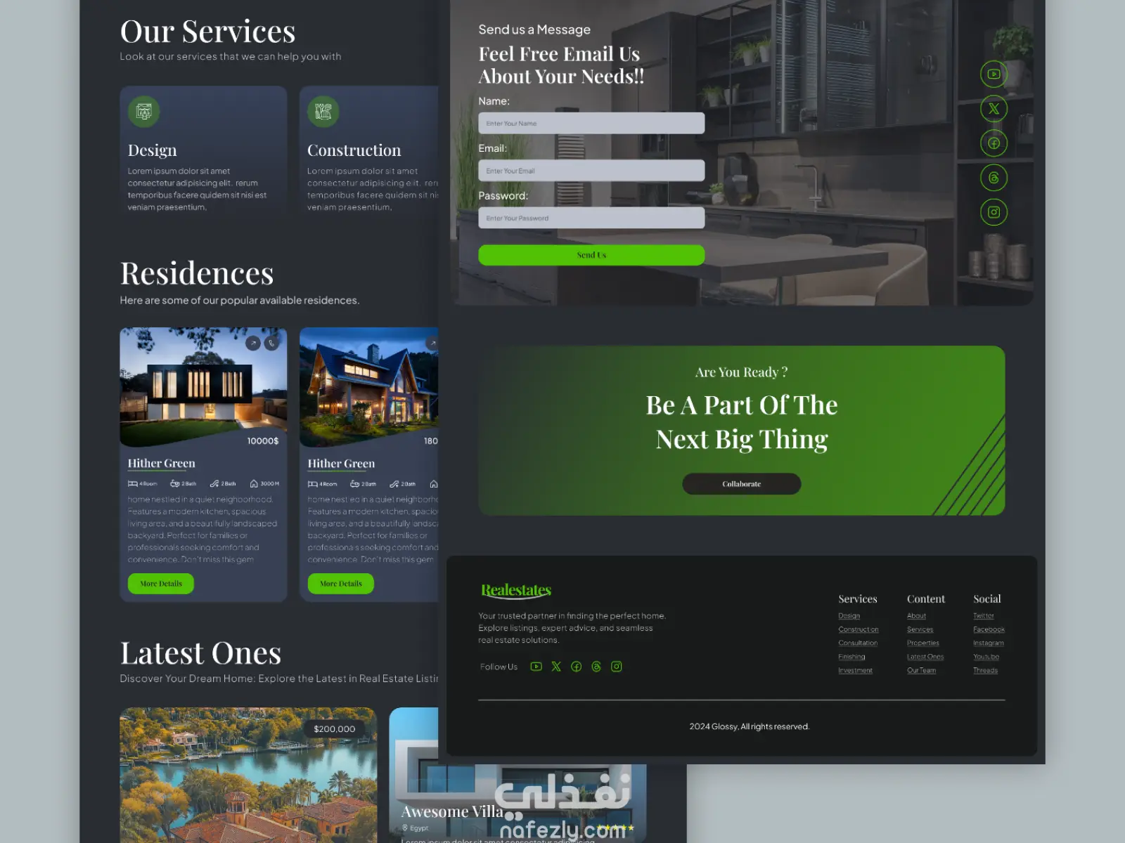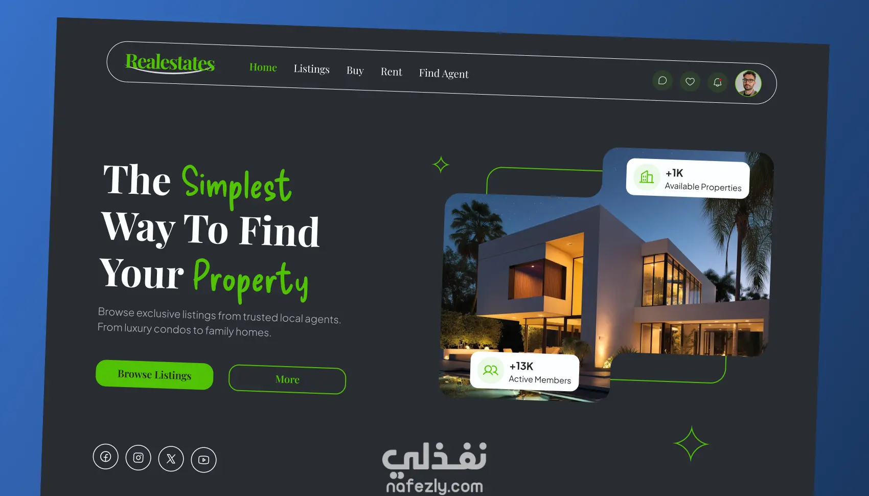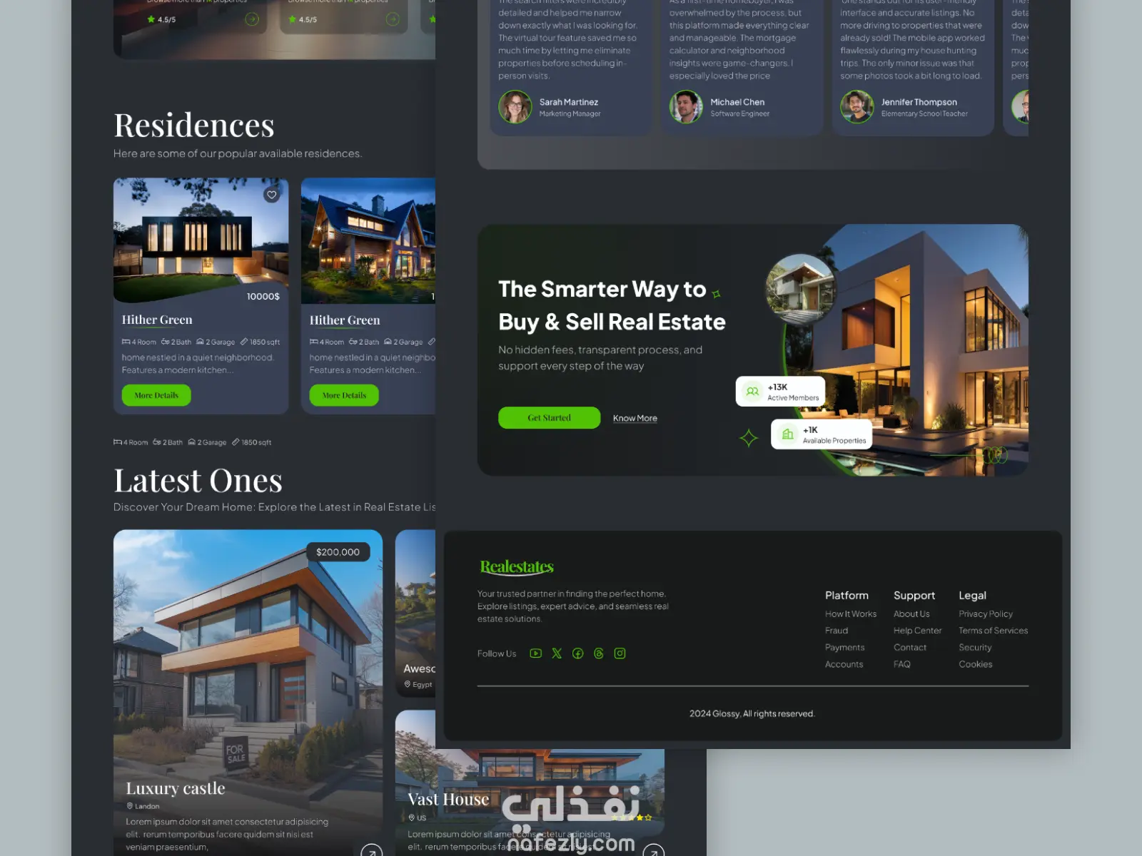 - سلايدر تفاعلي للعقارات الحديثة وأقسام المنصة.