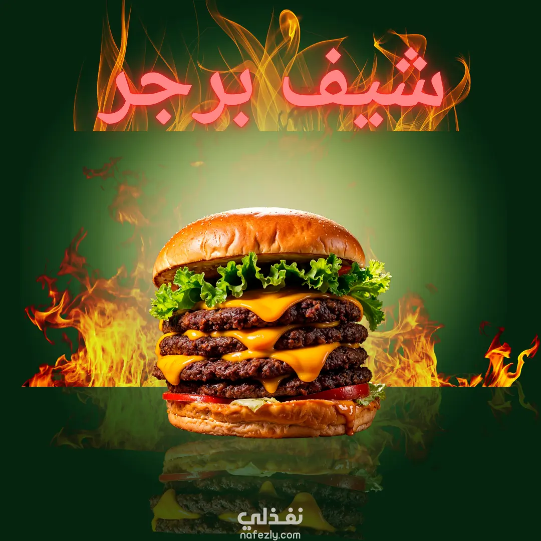 تصميم بوست عن مطعم برجر بطريقة احترافية وجذابة مع مؤثرات بصرية باستخدام طريقة الدمج والمراية مع استخدام اللون الاخضر كخلفية للتنويه عن الأكل الصحى