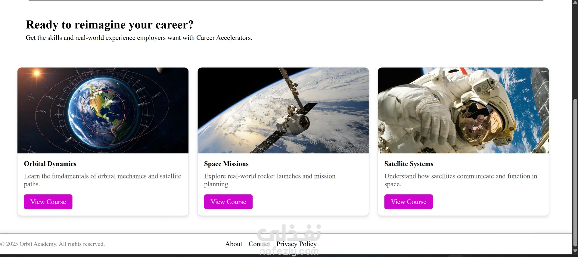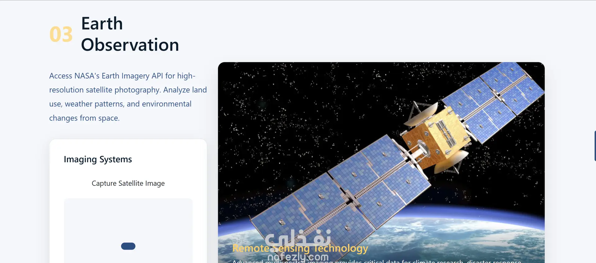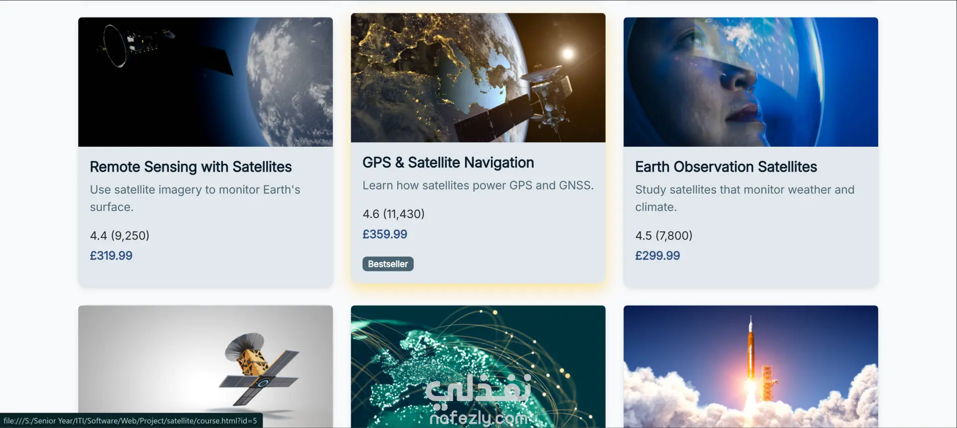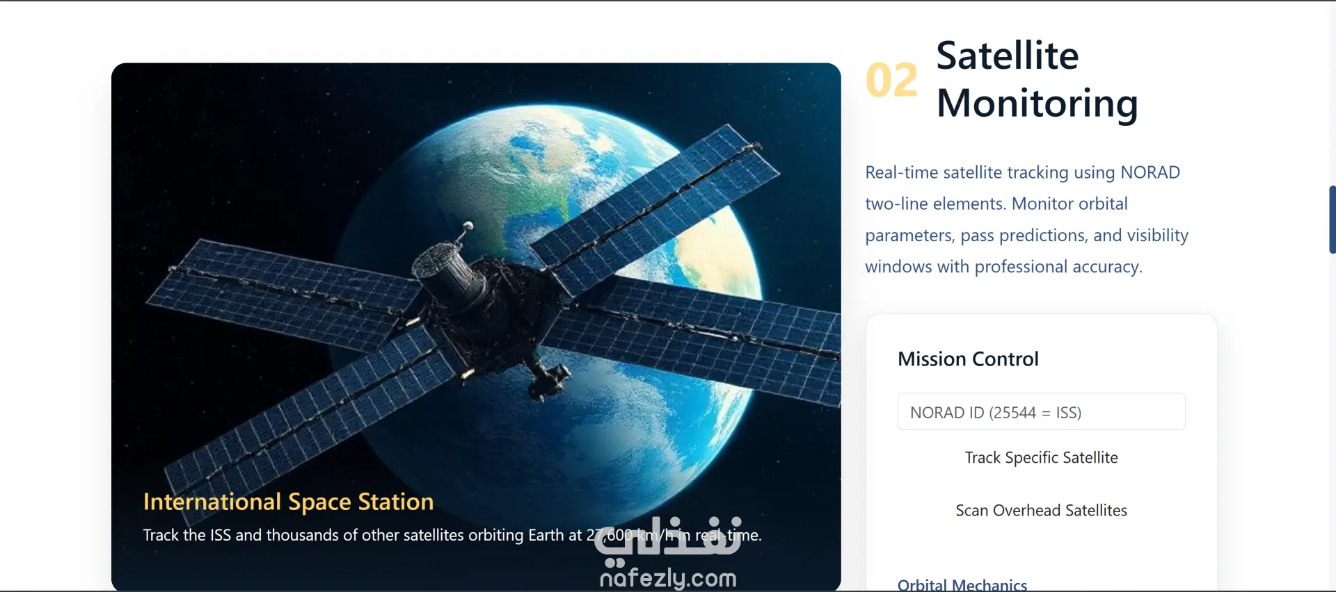 الموقع عبارة عن أكاديمية تعليمية أونلاين متخصصة في كورسات مجال الفضاء والأقمار الصناعية. فيه كورسات متنوعة زي ميكانيكا المدارات، أنظمة الأقمار الصناعية، الاستشعار عن بعد، الملاحة GPS، وتصميم المهمات الفضائية. كمان بيوفر أدوات تفاعلية لمتابعة الأقمار في الوقت الحقيقي، تحليل صور الأرض، متابعة الطقس، ومحاكاة مدارية للتعلم العملي.