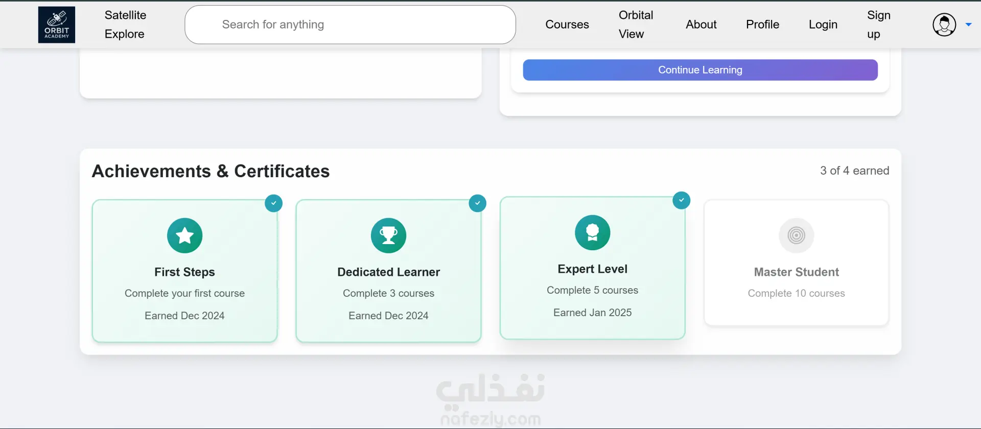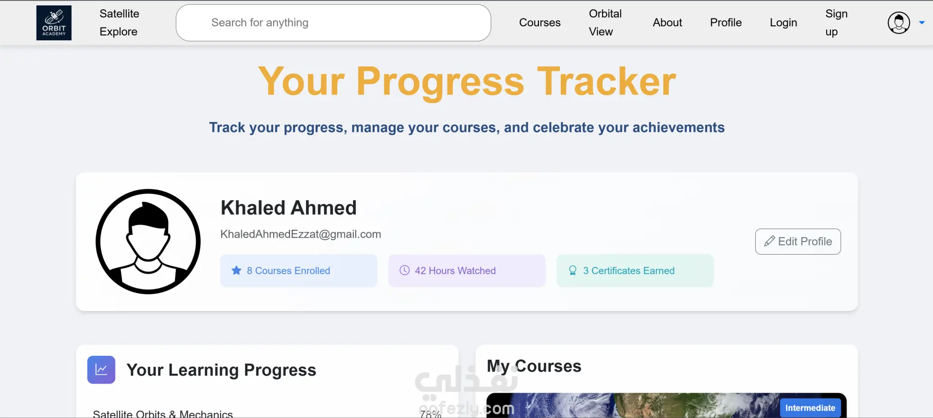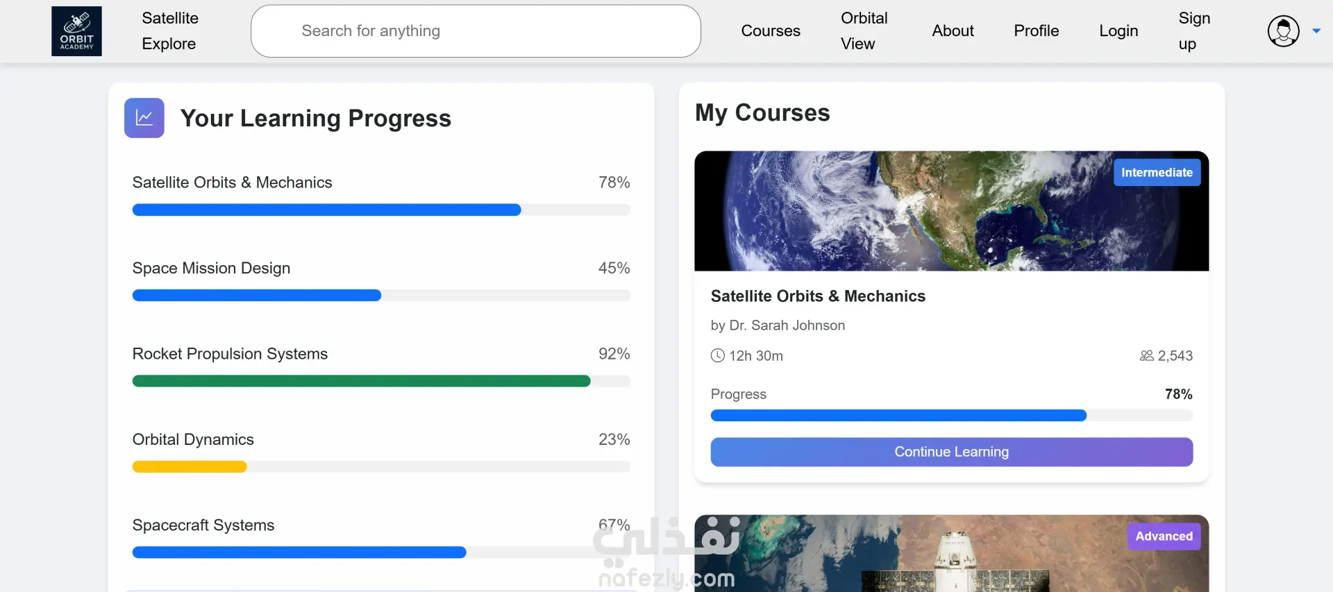 الموقع فيه نظام تسجيل/تتبع تقدم المستخدمين عشان يشوفوا الكورسات اللي خلصوها والشهادات اللي حصلوا عليها. معمول بشكل ريسپونسيف شغال على كل الأجهزة باستخدام HTML, CSS, JavaScript مع مكتبات زي Leaflet و APIs (NASA / OpenWeatherMap). مناسب جدًا للتعليم الإلكتروني لمحبي الفضاء أو أي حد عاوز يبدأ مسار مهني في تكنولوجيا الفضاء.