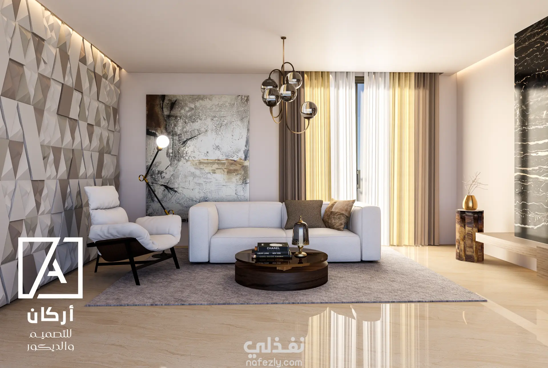 تم تزيين الجدار خلف منطقة الجلوس بلوحة هندسية ثلاثية الأبعاد، مما يضفي عمقًا ولمسة فنية عصرية. ويمنح مزيج من أريكة بيضاء فاخرة، وكرسي استرخاء عصري، وطاولة قهوة خشبية دائرية أنيقة، المكان جوًا دافئًا وراقيًا.