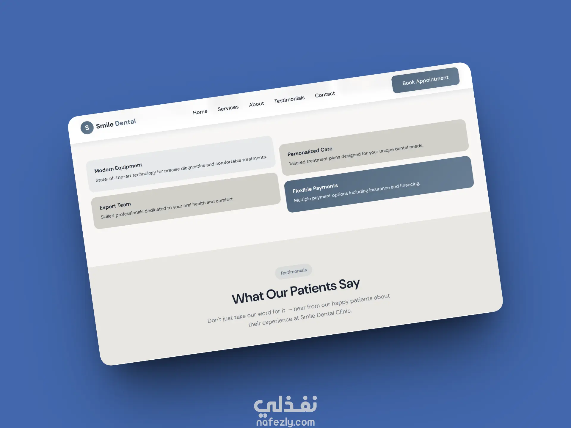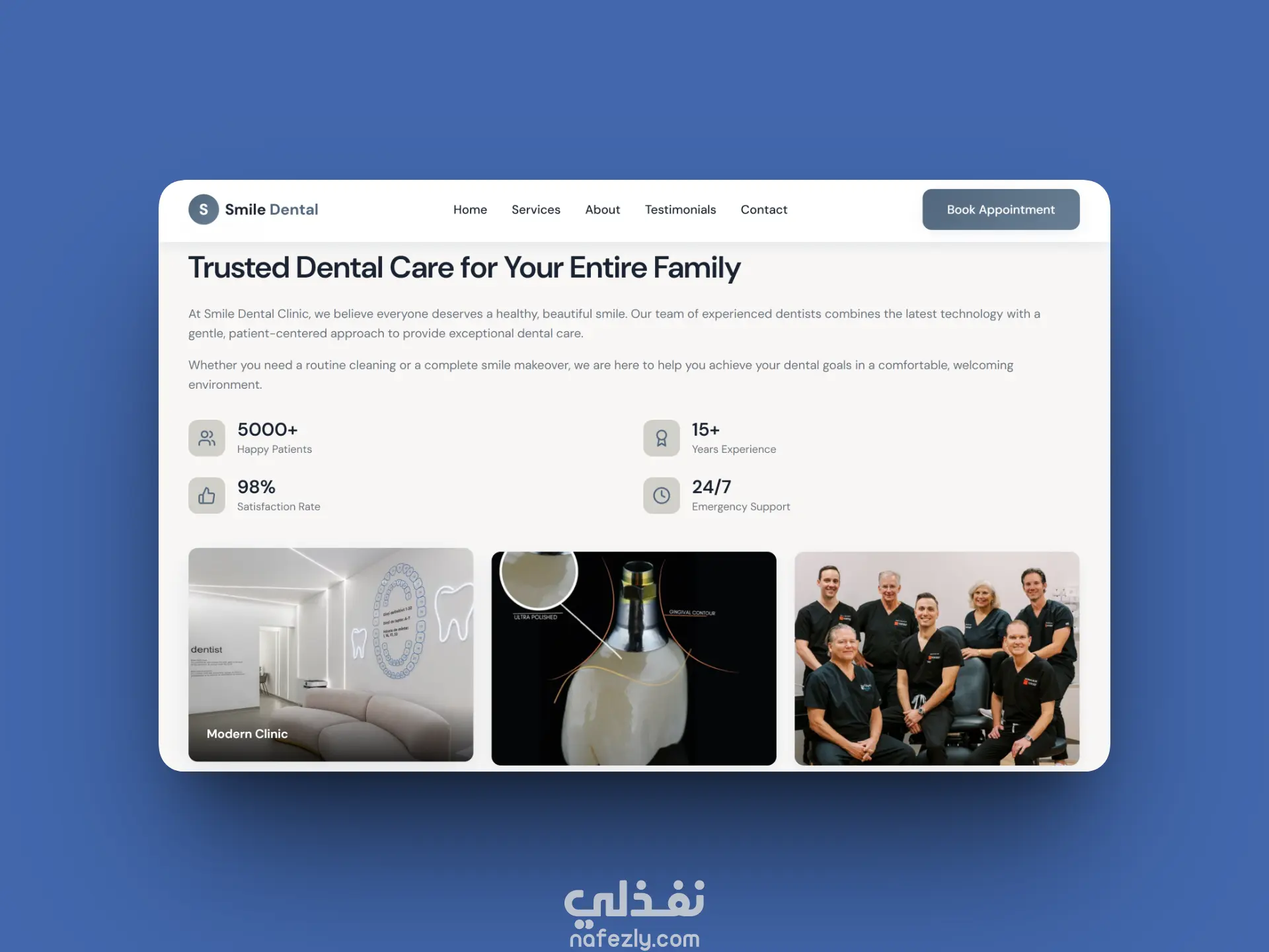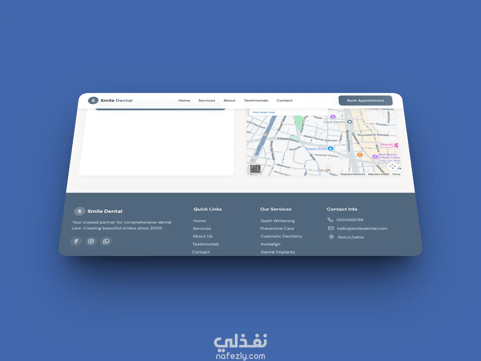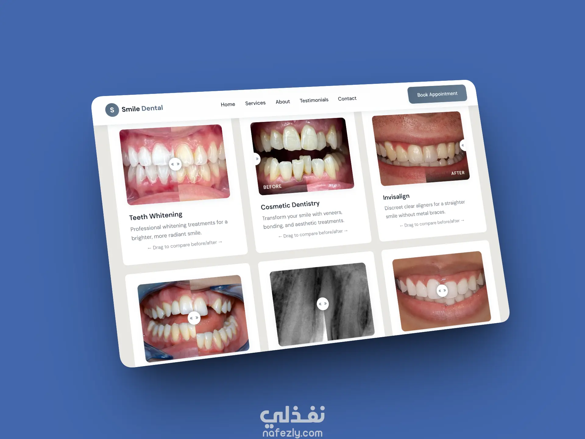 موقع إلكتروني جاهز بالكامل لعيادات الأسنان بتصميم حديث واحترافي يساعد الأطباء على عرض خدماتهم بطريقة جذابة وواضحة. يشمل الموقع صفحة رئيسية، صفحة خدمات (تبييض الأسنان – تجميل الأسنان – الإنفزلاين – الزراعة – الكشف الدوري)، معرض قبل/بعد، صفحة من نحن، صفحة تواصل، ونموذج حجز مواعيد. الموقع متجاوب مع جميع الأجهزة، سريع، صديق لمحركات البحث، وسهل التعديل. مناسب للعيادات التي ترغب في زيادة عدد المرضى وعرض خدماتها بأسلوب احترافي.