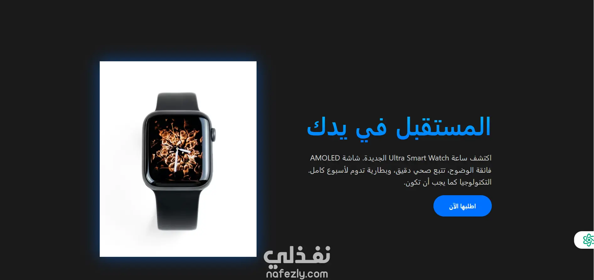 تصميم صفحة هبوط (Landing Page) لمنتج ساعة ذكية (Dark Mode)