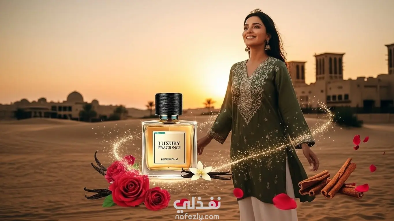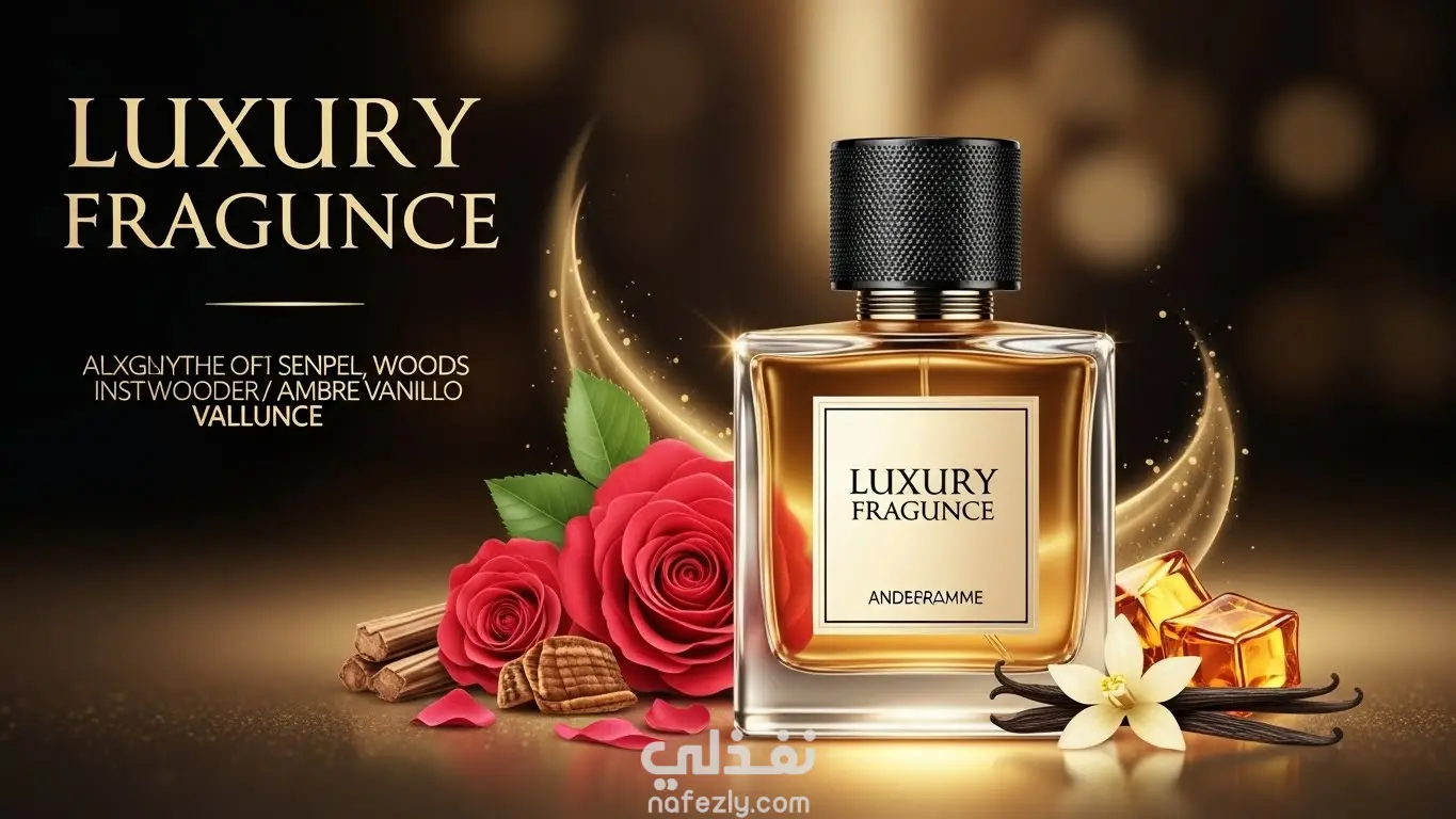 إبراز مكونات العطر (الورود، الفانيليا، الأخشاب) بأسلوب إعلاني جذاب