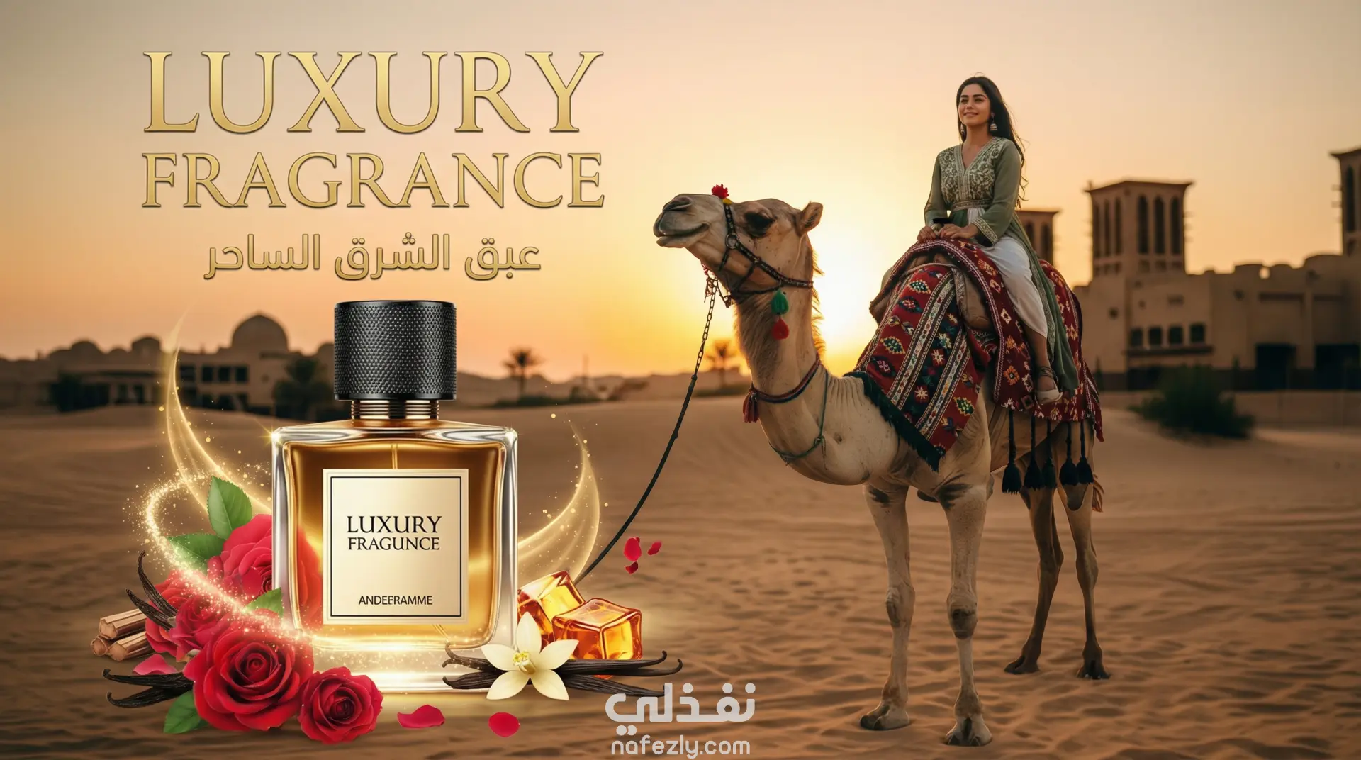 تصميم إعلان احترافي لعطر فاخر مستوحى من روح الشرق وسحر الصحراء العربية، يجمع بين الفخامة العصرية والهوية التراثية الأصيلة.