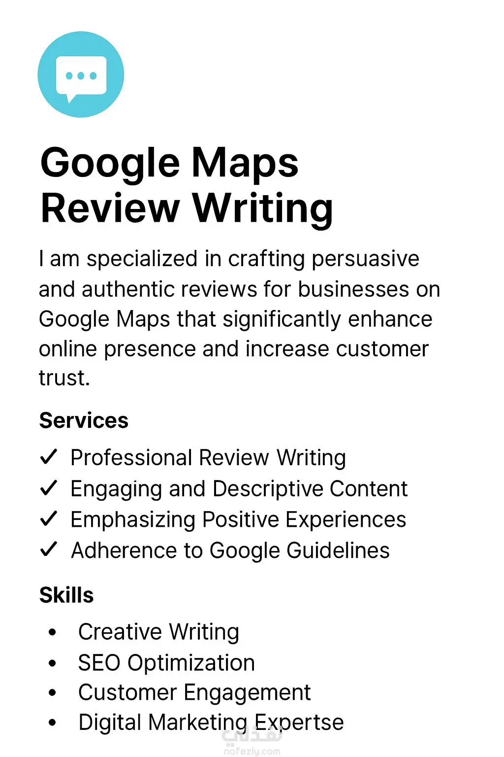 أقدّم خدمة متخصصة في كتابة وصياغة تقييمات Google Maps بأسلوب تسويقي ذكي يهدف إلى تعزيز الثقة، تحسين السمعة الرقمية، وزيادة الإقبال على النشاط التجاري