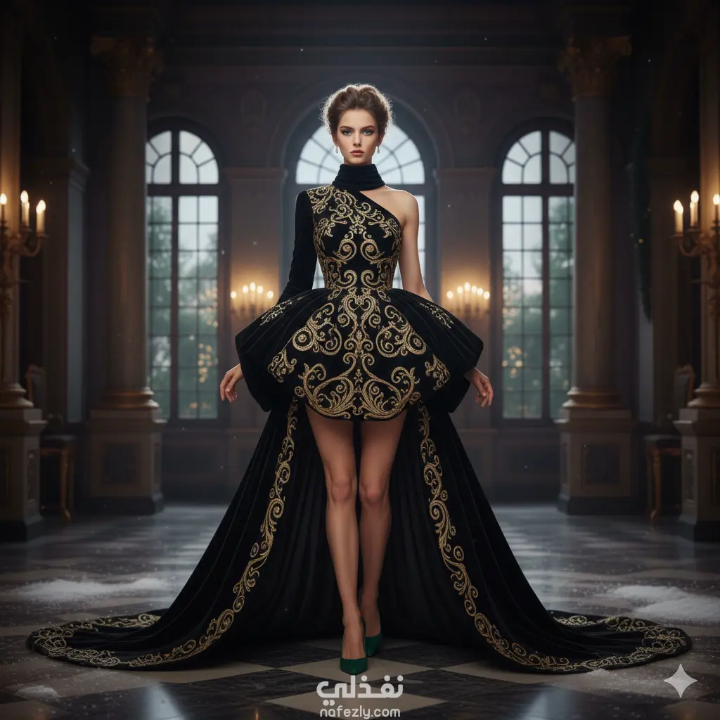 النمط والتصميم: فستان قصير من الأمام وطويل جداً من الخلف (High-Low) مع لمسة عصرية. القصة مميزة جداً مع تنورة صغيرة منتفخة ومجسمة حول الوركين (Peplum/Bubble Skirt). لوحة الألوان: الأسود المخملي الغني مع التطريزات الذهبية الفخمة. القصة والأكمام: يتميز بكتف واحد عاري والآخر مغطى بكم طويل وضيق مع ياقة عالية ملتفة حول العنق (Halter/Turtleneck-like). التطريز: هو جوهر الفستان. يتميز بتطريزات كثيفة ومعقدة على شكل نقوش وزخارف باروكية أو إمبراطورية باللون الذهبي البراق، تغطي التنورة القصيرة والجزء العلوي. الذيل (Train): يتميز بذيل ملكي طويل جداً ومترف من قماش أسود داكن، ينسدل من الخصر ويغطي الأرض بالكامل، ومطرز أيضاً على أطرافه بالنقوش الذهبية. الأجواء العامة: يجمع بين القوة (اللون الأسود) والثراء والتاريخ (الزخارف الذهبية)، مما يجعله مثالياً لأميرة أو ملكة شابة قوية في حفل تتويج أو حفلة بالغة الأهمية داخل قاعة