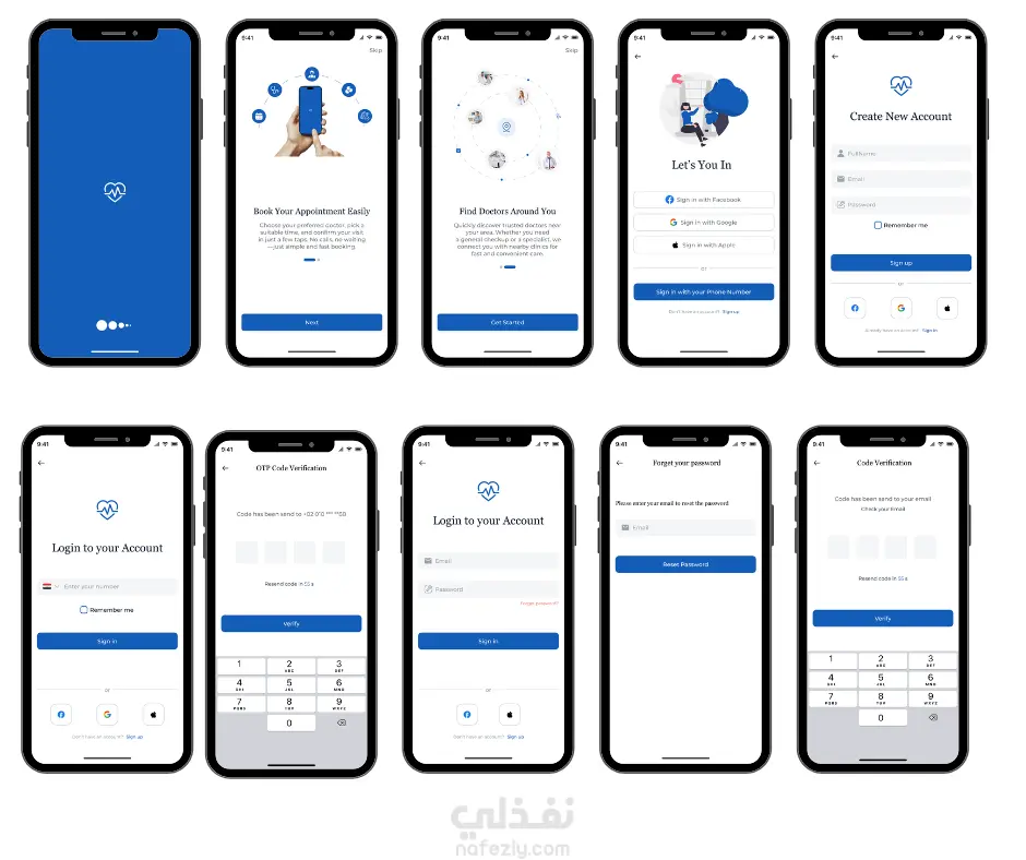تم تصميم واجهات احترافية لتطبيق موبايل لحجز المواعيد الطبية يتيح للمستخدم إنشاء حساب جديد، تسجيل الدخول عبر البريد أو الشبكات الاجتماعية، التحقق برمز OTP، واسترجاع كلمة المرور بسهولة. يعتمد التصميم على ألوان طبية هادئة باللون الأزرق مع أيقونات واضحة ومساحات بيضاء لواجهة نظيفة، مع التركيز على تبسيط خطوات الحجز وتسجيل الدخول لتقديم تجربة استخدام سلسة للمريض والطبيب.