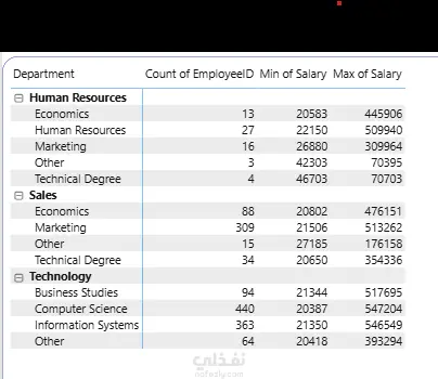 إجمالي عدد الموظفين حسب الجنس، والقسم، والعرق، والمسافة من المنزل.