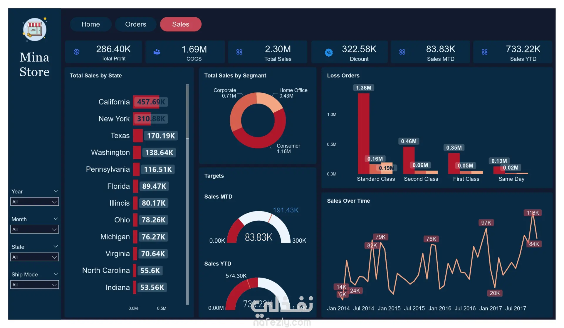 يعرض المشروع بيانات المبيعات، والطلبات، والأرباح، وأنماط الخصومات، وأداء الشحن في مختلف الولايات الأمريكية وشرائح العملاء.