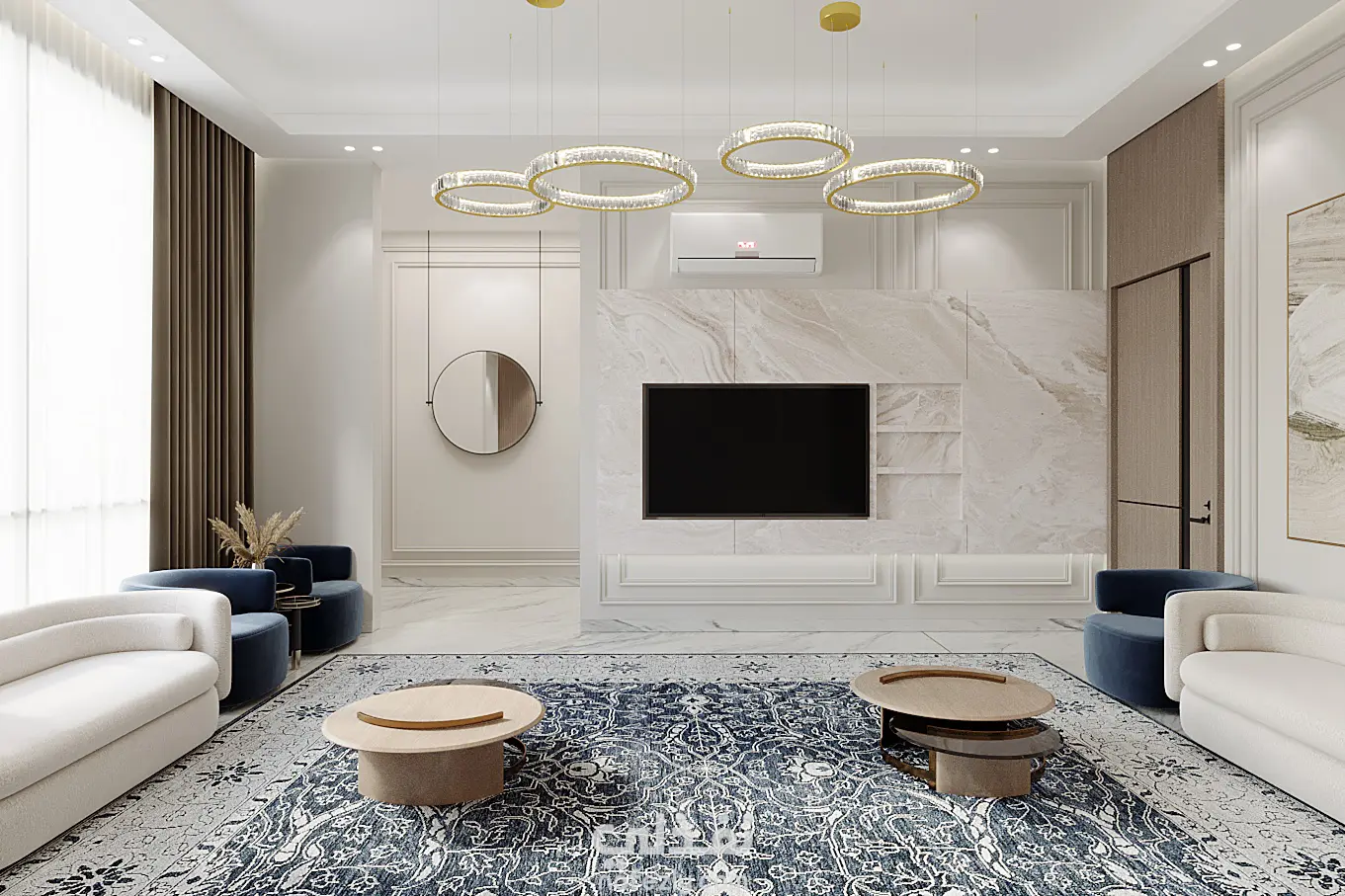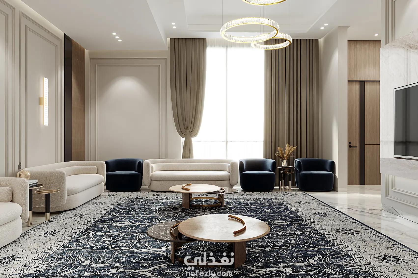 التصميم مكون من تداخل عناصر و طرز تصميمية مختلفة من حيث الالوان و قطع الاثاث و ايضا الفخامة في بعض العناصر