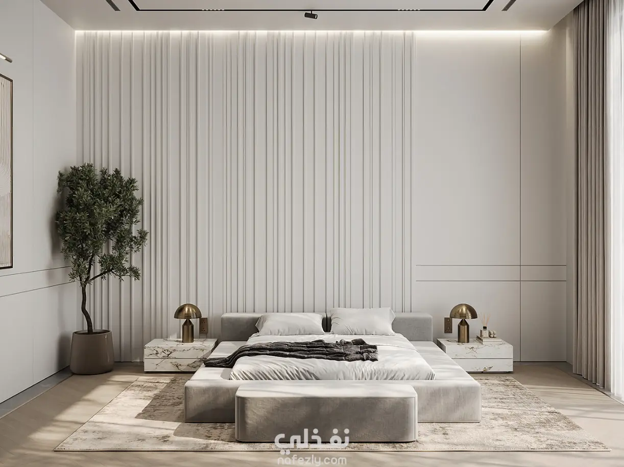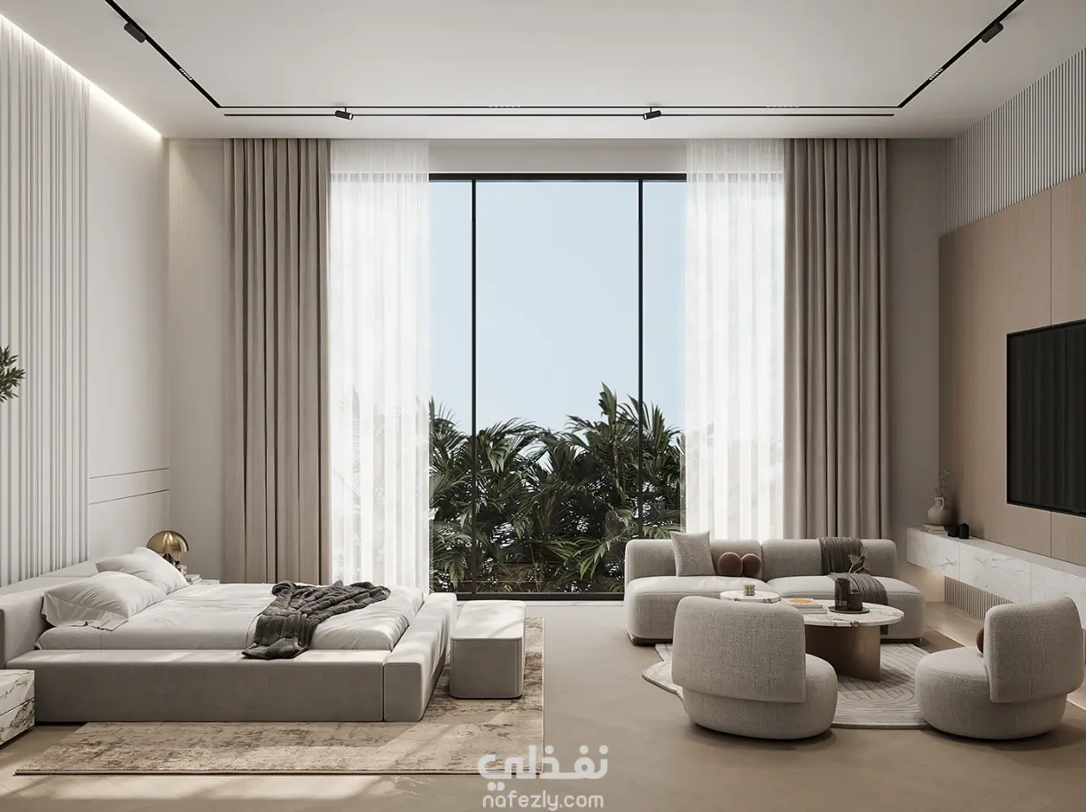 تصميم بسيط وهادئ يجمع بين الراحة والبساطة والحداثة مع ترك مساحات مناسبة للحركة واختيار اللوان تناسب الفراغ