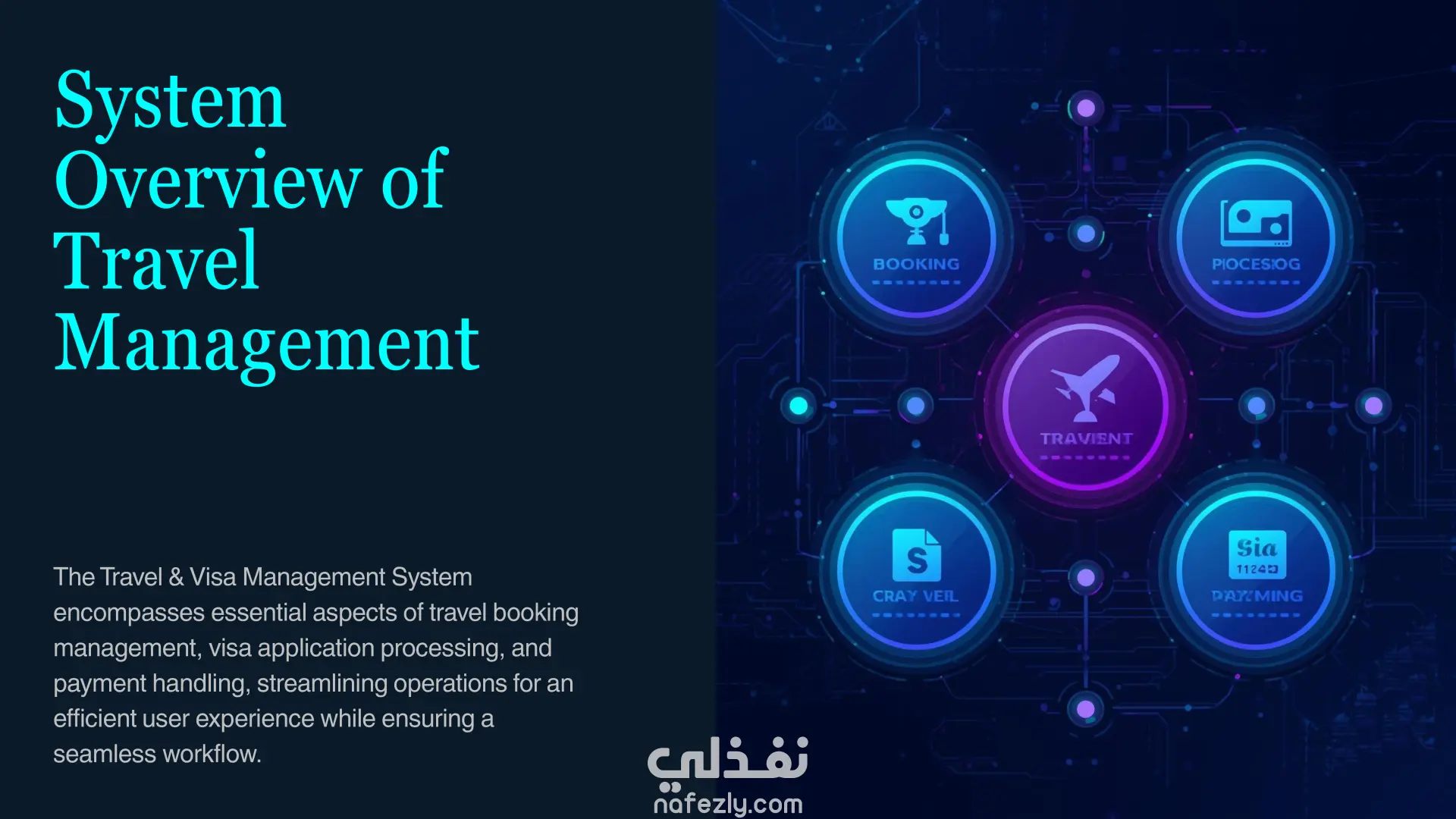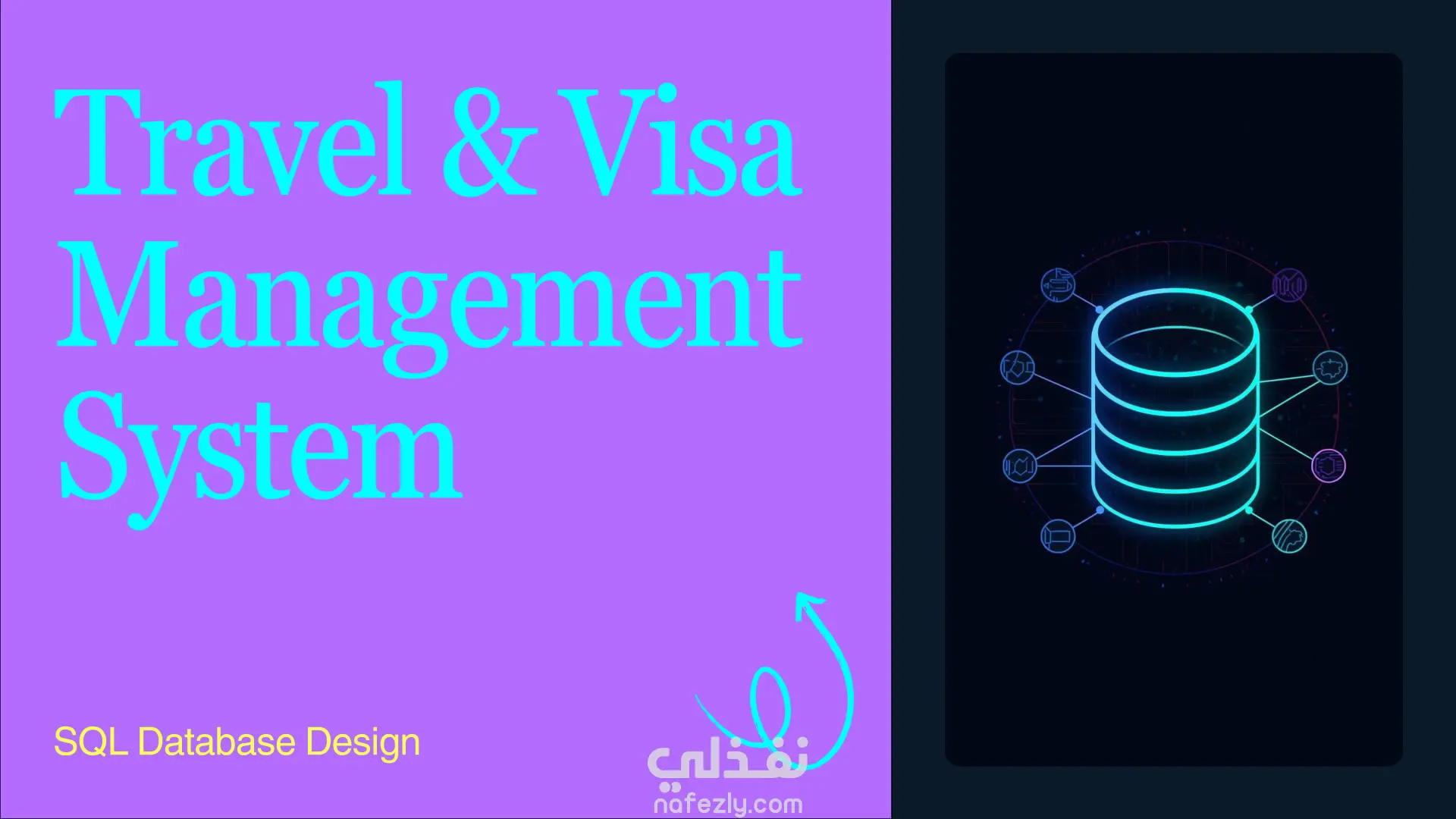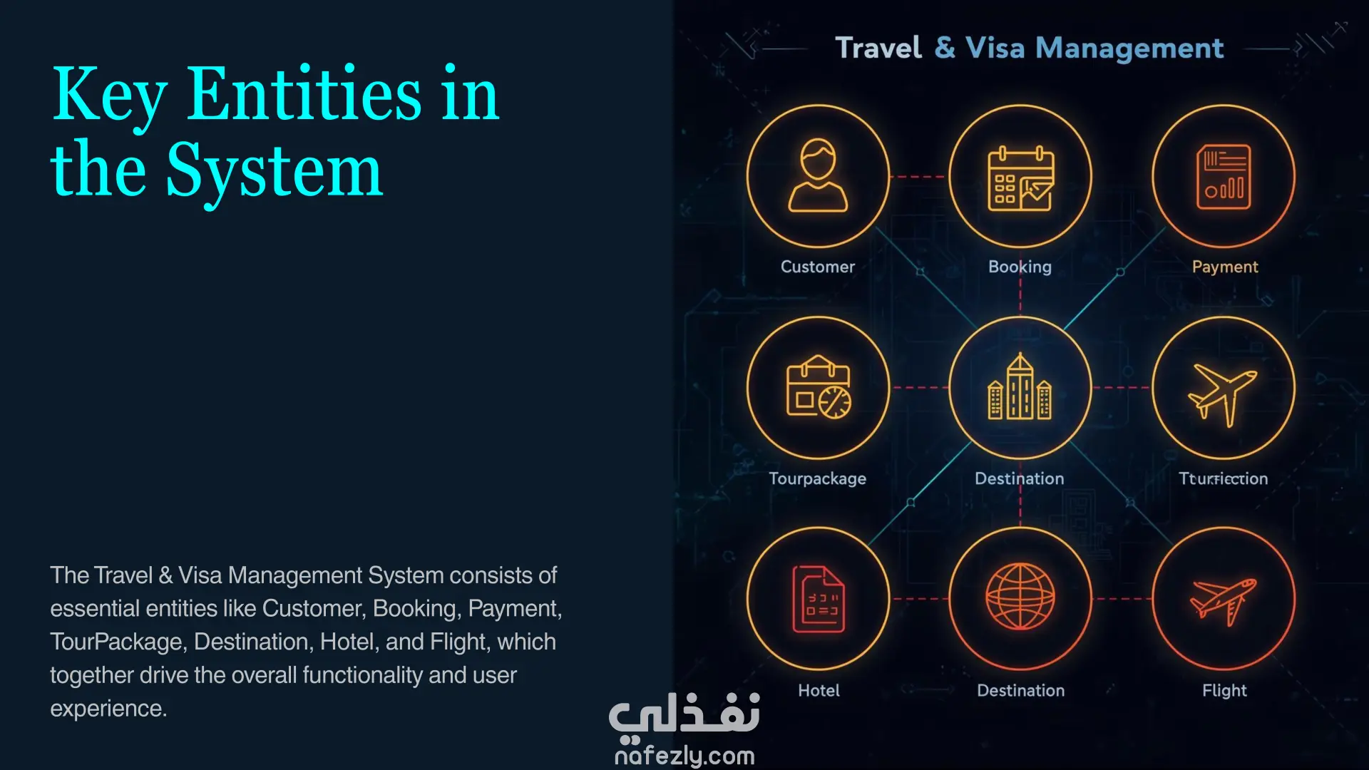 A professional PowerPoint presentation focused on database design using an Entity Relationship Diagram (ERD) for a Travel & Visa Management System. The presentation explains system entities, relationships, and data structure to illustrate how travel booking, visa processing, and payments are organized at the database level.