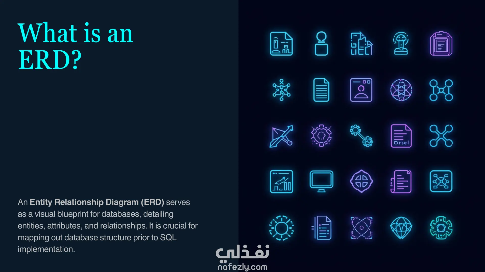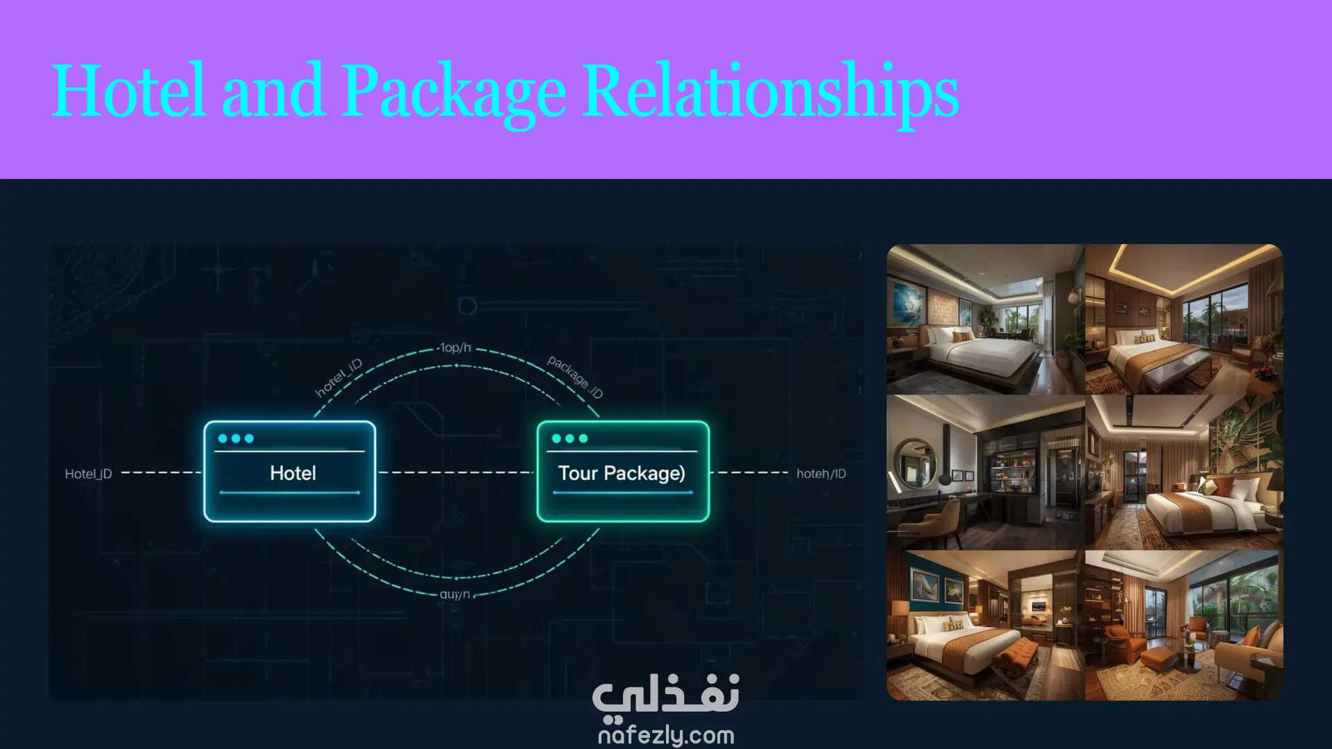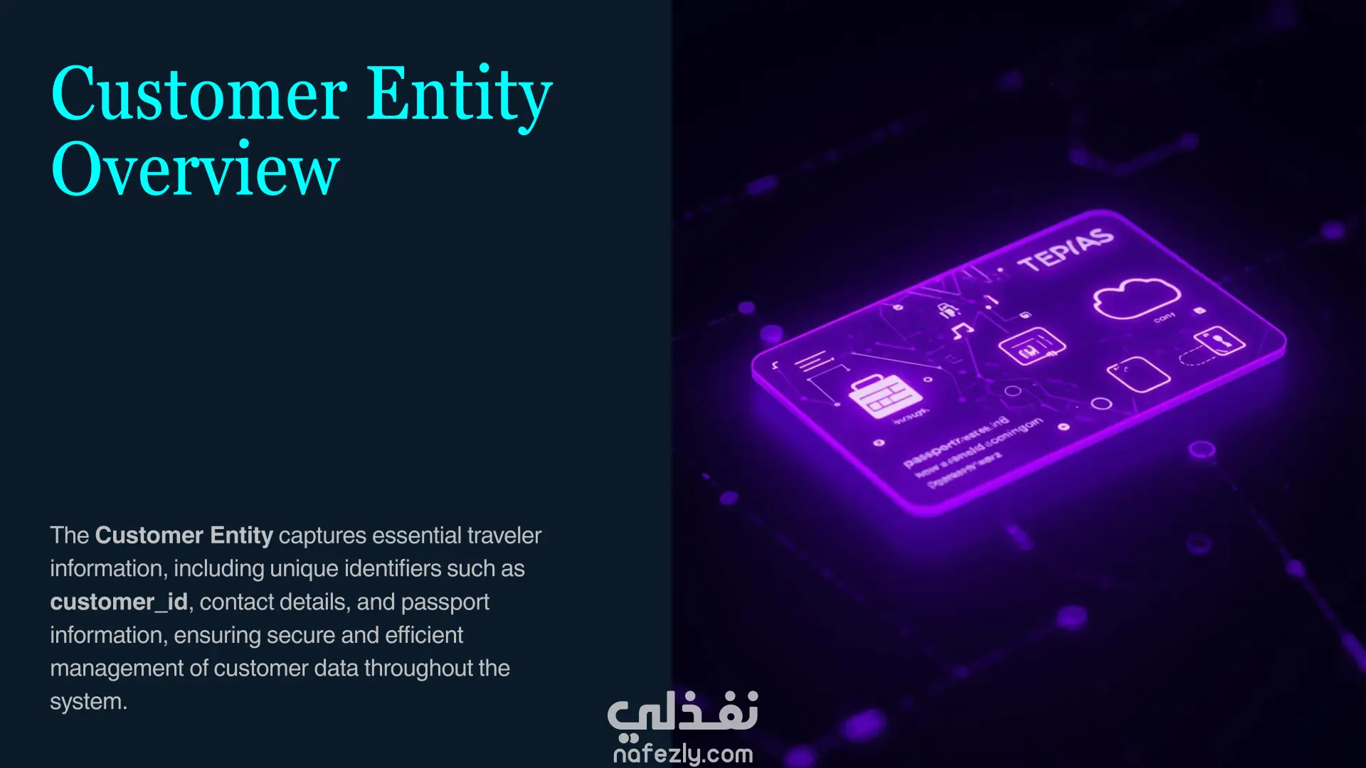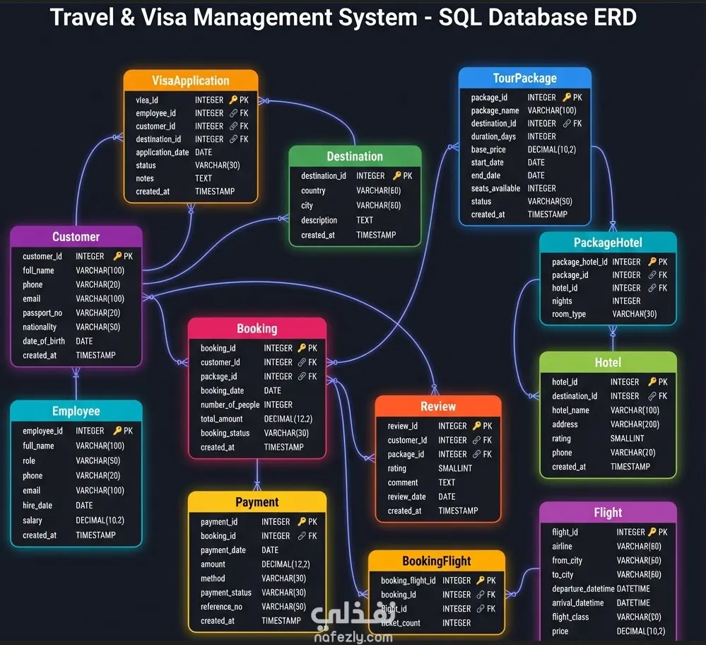 A professional PowerPoint presentation focused on database design using an Entity Relationship Diagram (ERD) for a Travel & Visa Management System. The presentation explains system entities, relationships, and data structure to illustrate how travel booking, visa processing, and payments are organized at the database level.
