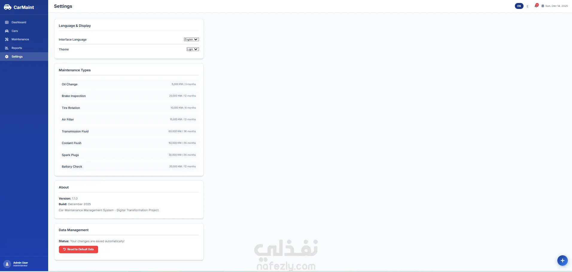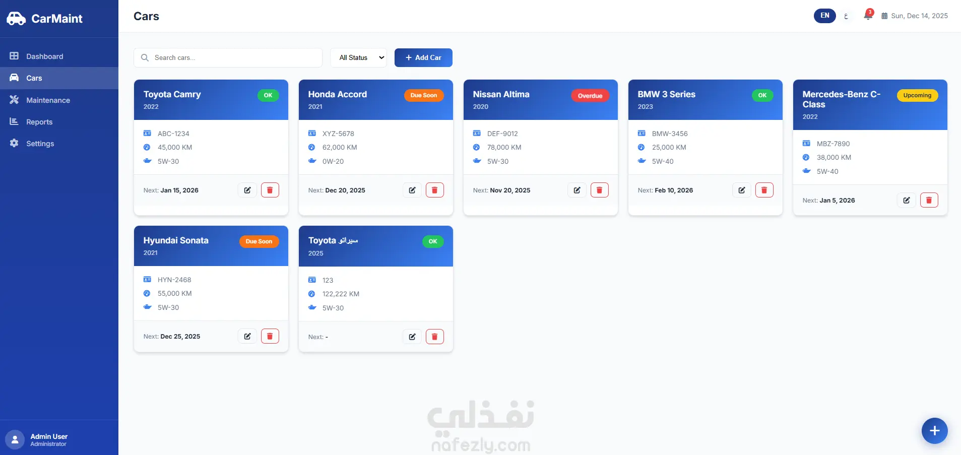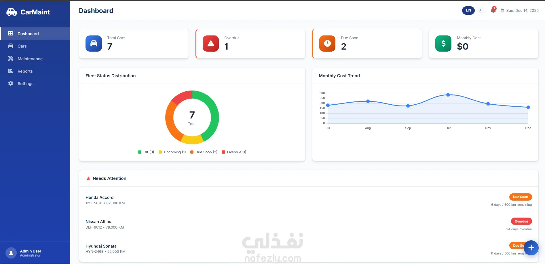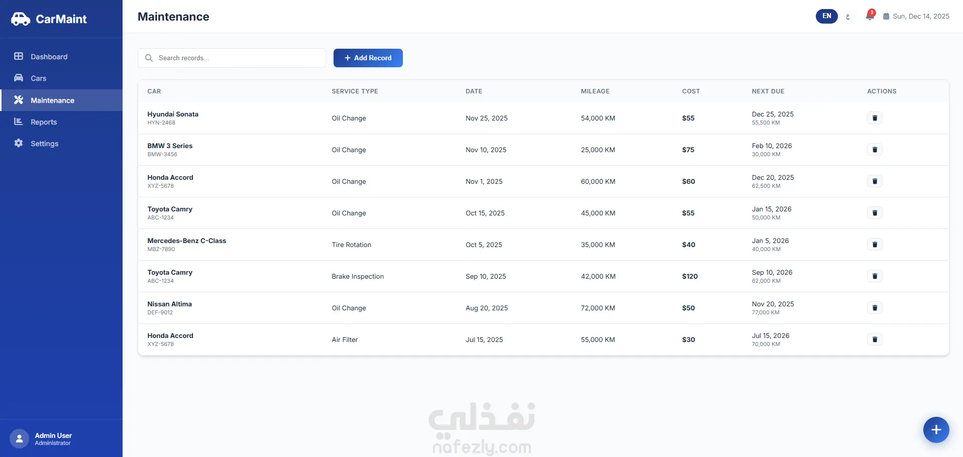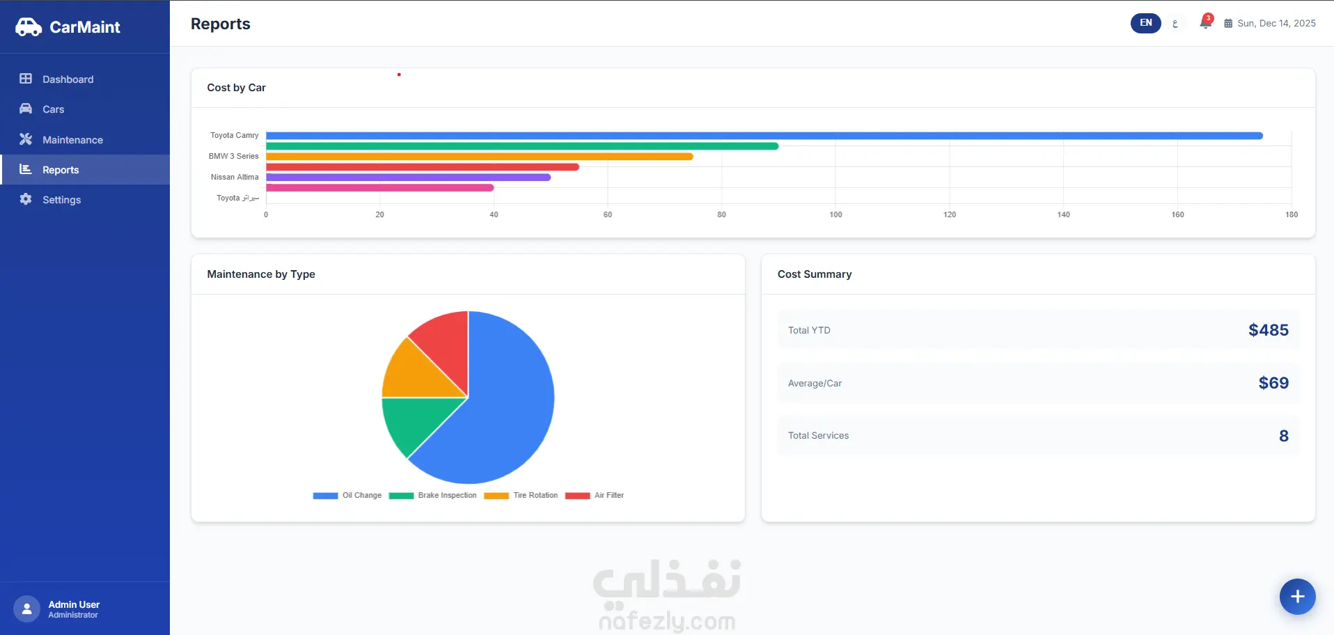 A responsive web-based Car Maintenance Management System that allows users to manage vehicles, track maintenance records, monitor costs, generate reports, and receive service alerts through an intuitive dashboard interface.