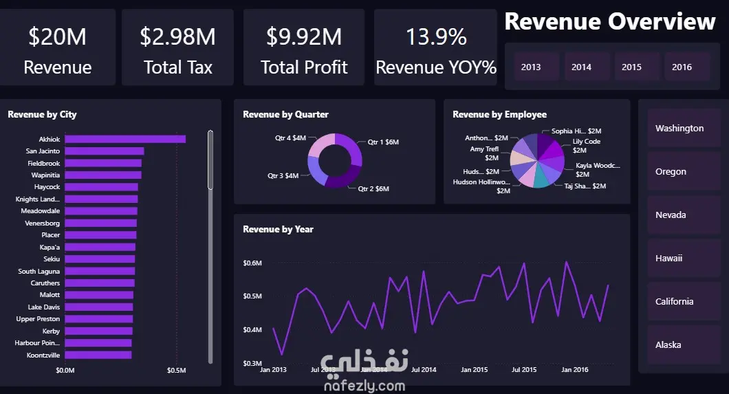 A professional dashboard summarizing key financial metrics — revenue, tax, and profit — across regions, employees, and quarters.