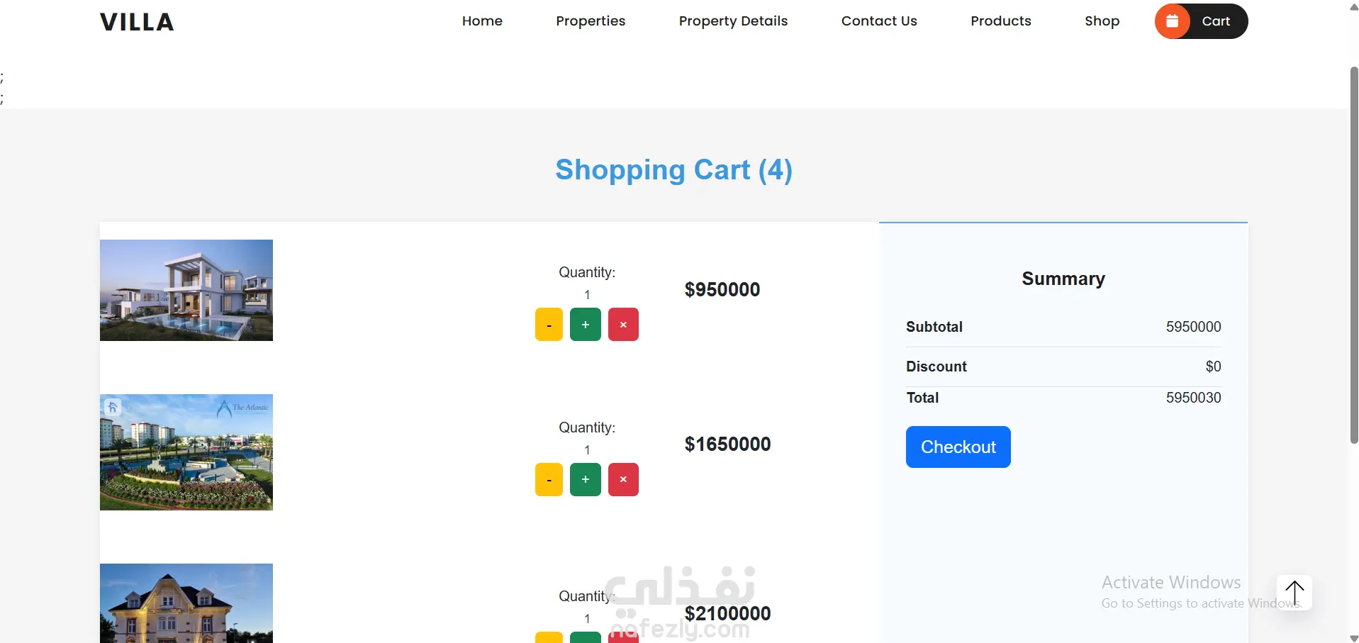 يحتوي المشروع على صفحات متعددة مثل: الصفحة الرئيسية، العقارات، تفاصيل العقار، التواصل، المنتجات، المتجر، وسلة المشتريات.